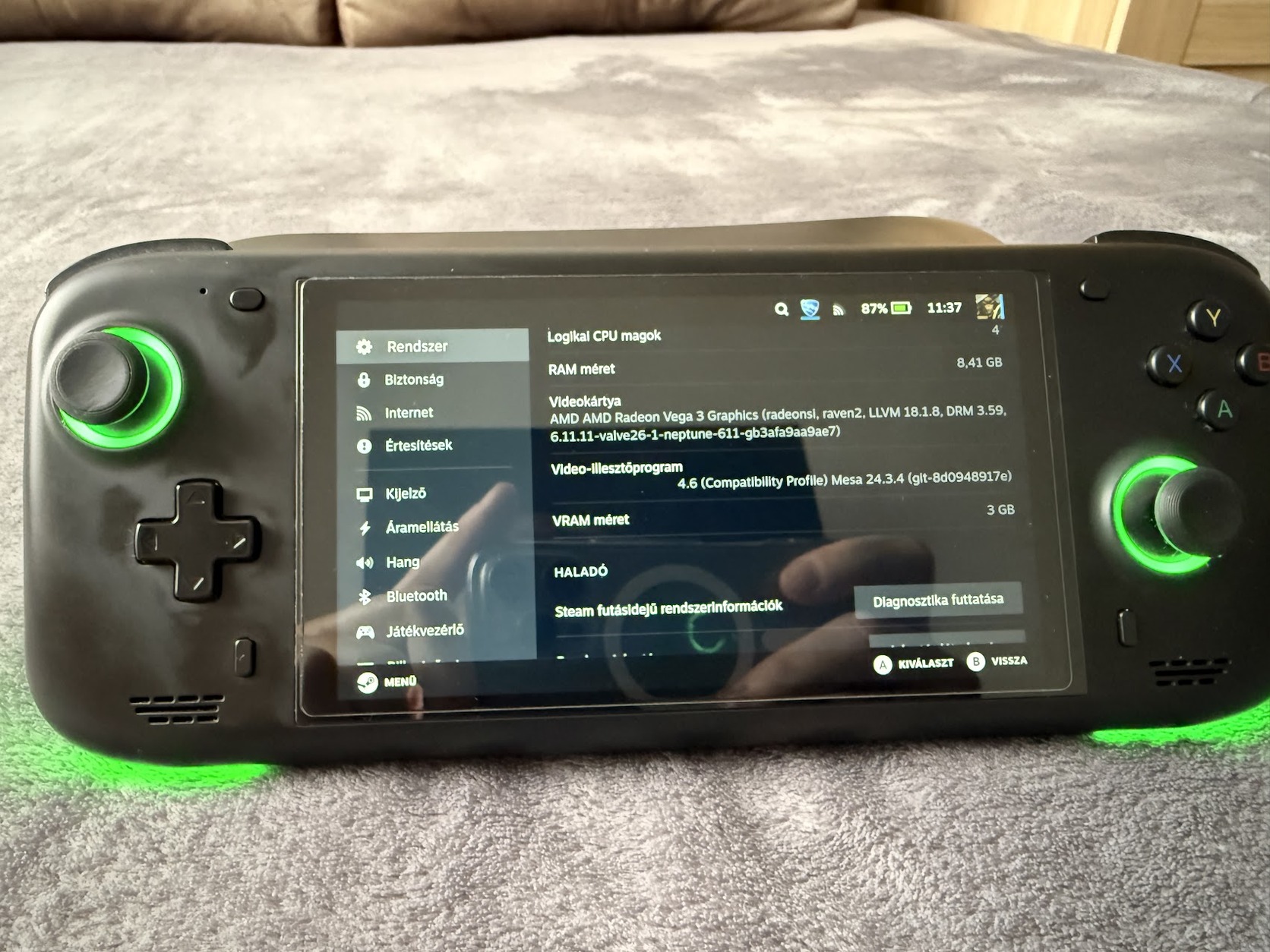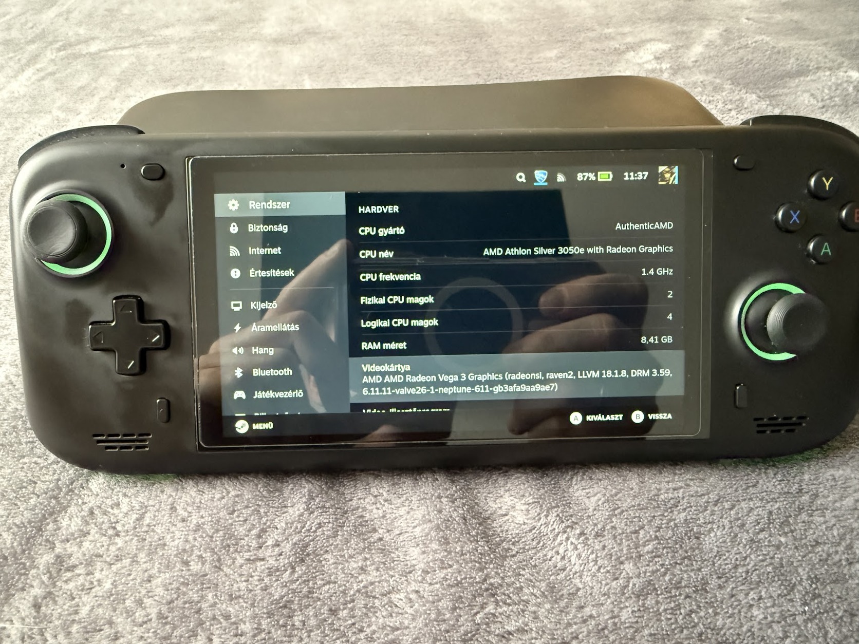 Jelenleg SteamOS fut rajta, amivel egyszerűbb játékok kényelmesen játszhatóak. (Brawlhalla, Rocket League, Emudeck-el WiiU-ig bármit emulál.)
