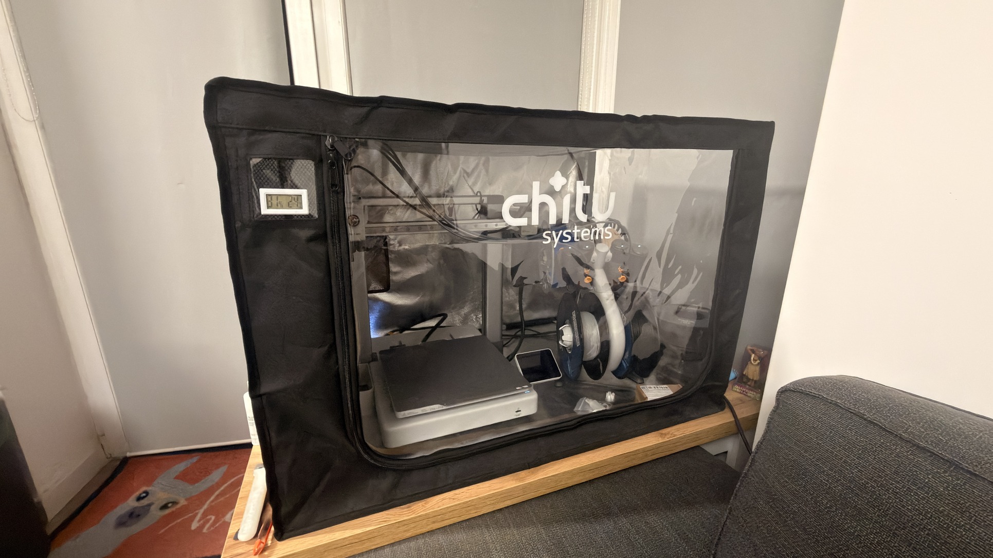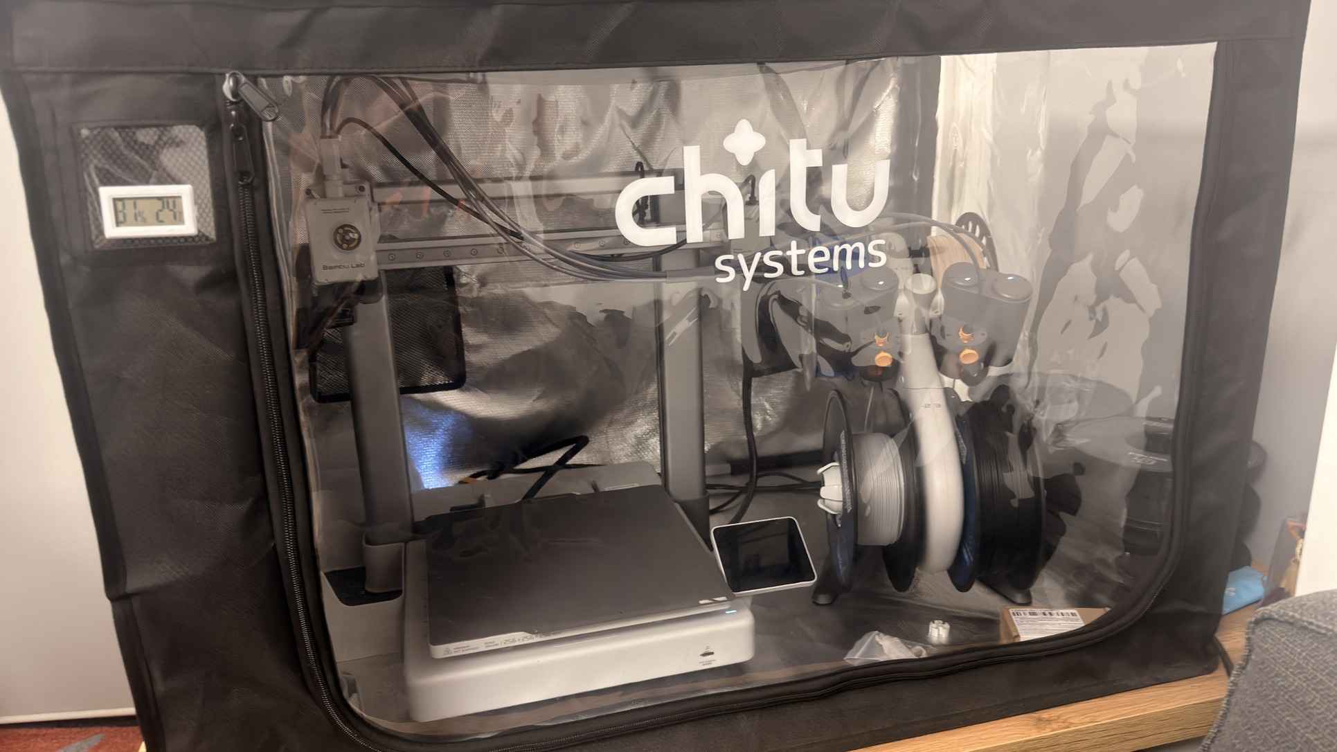 • Chitu Systems enclosure: védi a portól, hőmérséklet és páratartalom mérővel, bent tartja a nyomtatáskor keletkező kellemetlen szagokat, valamint ezáltal lehetőség nyílik ABS és egyéb más anyagok nyomtatására is, amikre egyébként alkalmatlan lenne az eszköz enclosure nélkül!