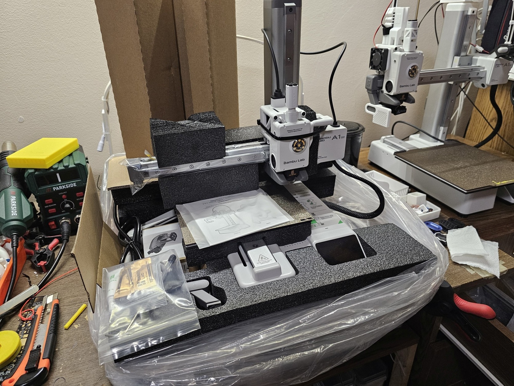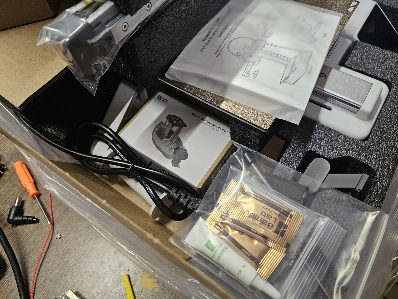 Minden tartozék megvan és természetesen adom hozzá, dobozzal együtt, egyedül az AMS-tartozékait vettem ki (ams, ams láb, ams filamenttartó, ams láb csavarjai).