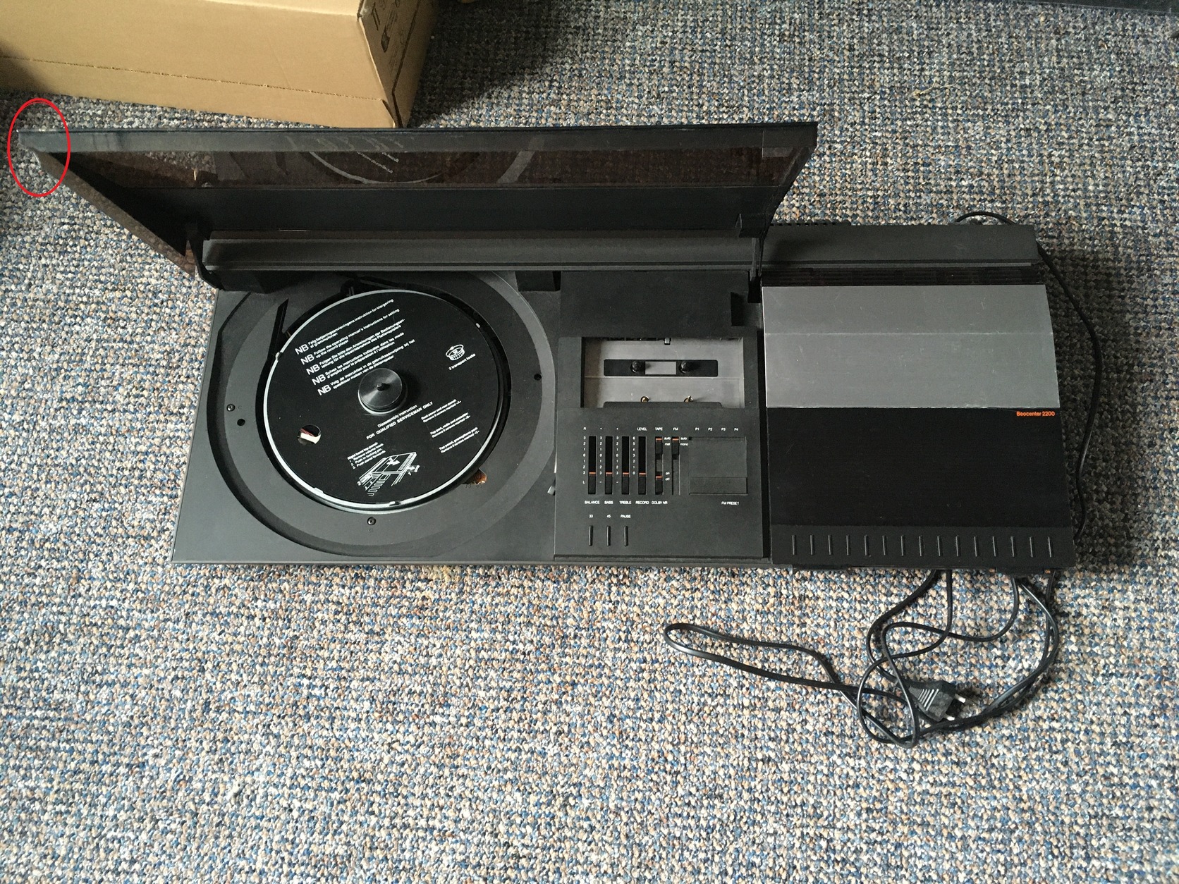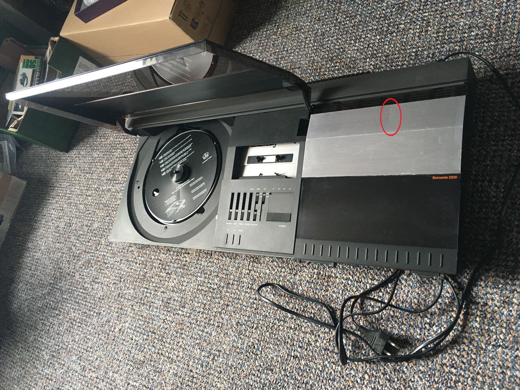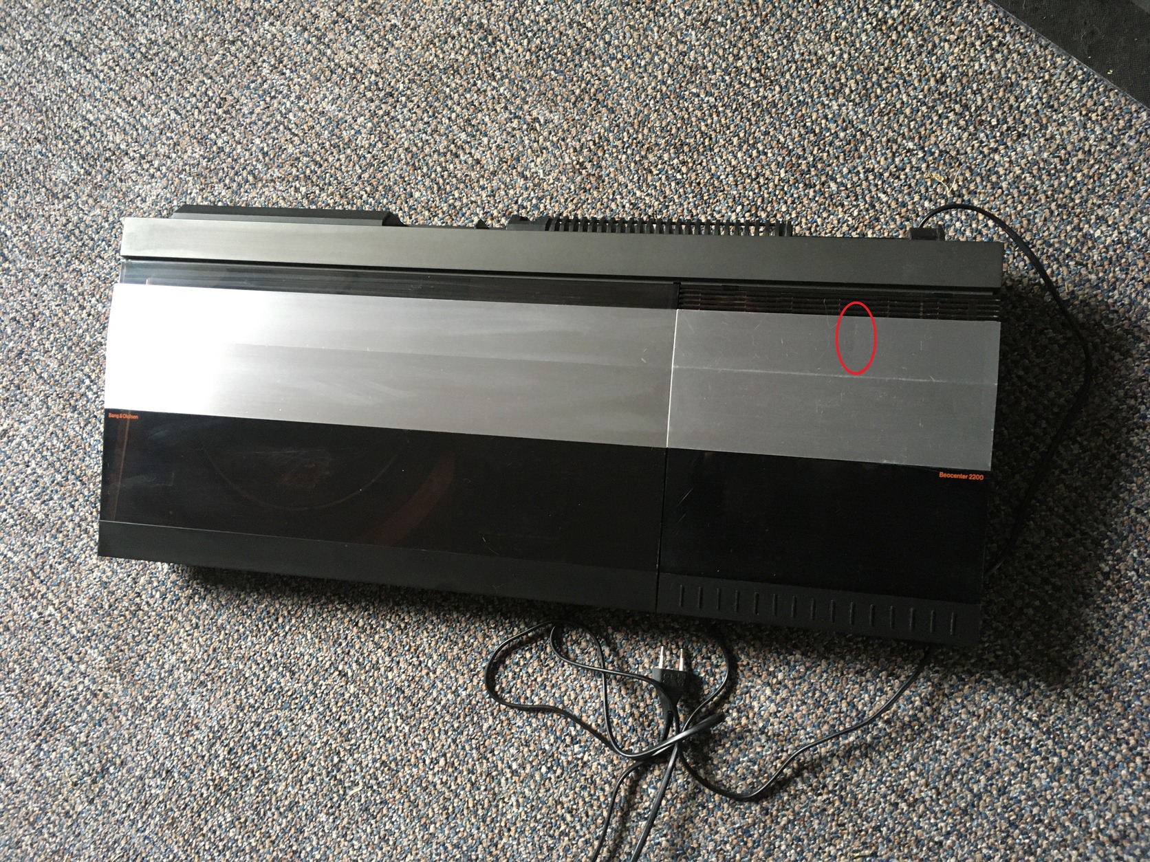Продается магнитофон Bang & Olufsen Beocenter 2200 в состоянии, показанном на фото. В таком виде я его и получил. Есть небольшая вмятина — смотрите фото. На внутренней стороне крышки отсутствует кусочек, который не виден в закрытом состоянии. Смотрите фото, я отметил его красными кружками. К сожалению, алюминиевый лоток для дисков проигрывателя был утерян во время переезда. Я не смог его найти. Проигрыватель работает. Иглу я уже продал. На магнитофоне несколько секунд слышно, как запускается мотор, но кассета не вращается. Резиновые ремни порваны. По крайней мере, мне так сказали. Радио работает. Два из четырех выходов для динамиков работают, а два не воспроизводят звук. Я им почти не пользовался. Я смог проверить только то, что написал выше. Иногда я бываю в Будапеште.