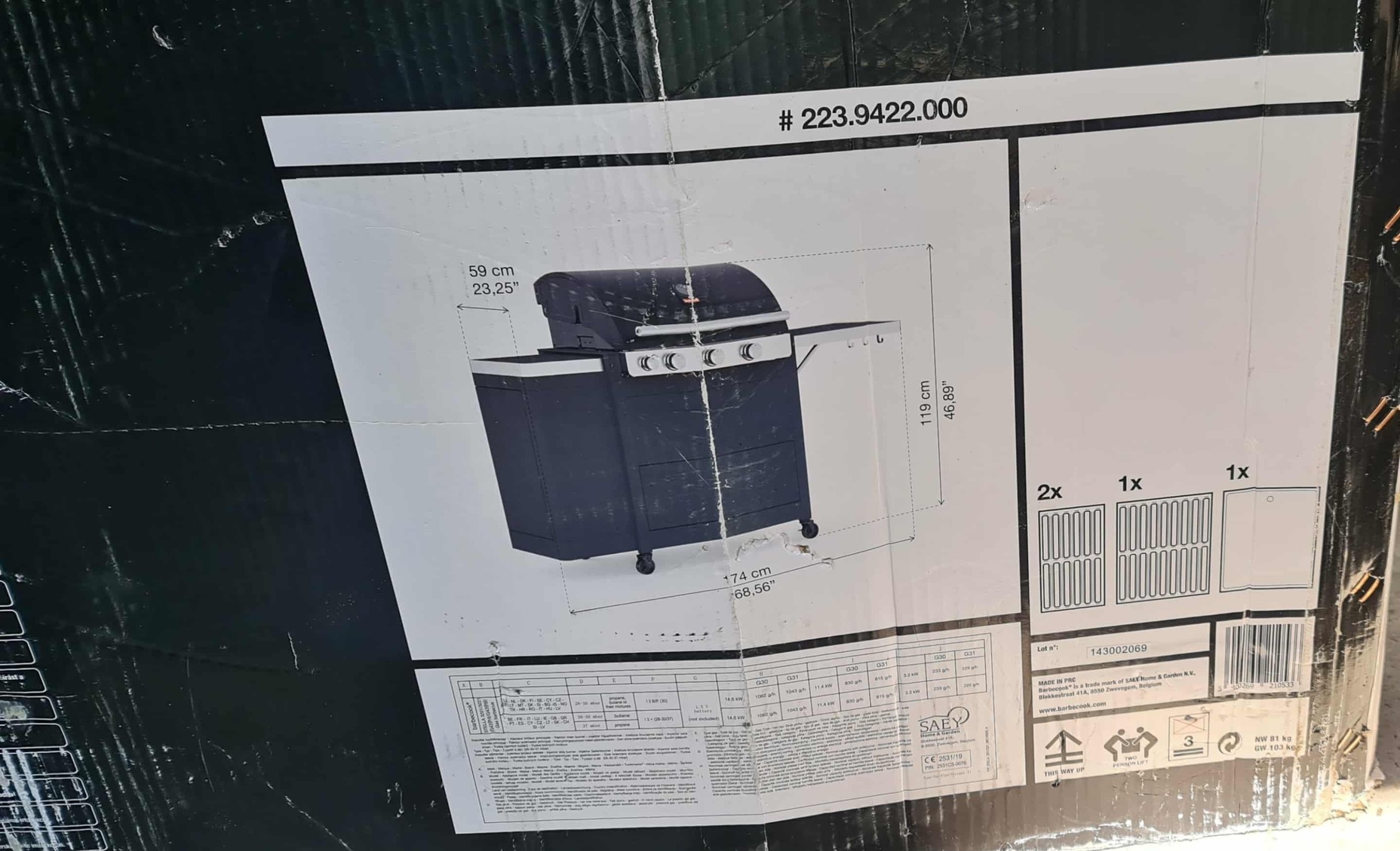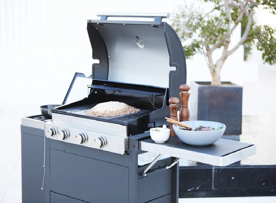 Főbb tulajdonságok: főégők száma: 3 főégők maximális teljesítménye: 11,4 kW oldalégők száma: 1 oldalégők teljesítménye: 3,2 kW sütőfelület: 1 × (35 × 43) cm 2 × (17,5 × 43) cm sütési magasság: 99 cm grillrács anyaga: zománcozott öntöttvas fedél anyaga: zománcozott acél tál anyaga: zománcozott acél kocsi anyaga: zománcozott acél fedél hőmérővel: igen tárolóhely: igen zsírelvezetés: igen görgők: 4 db Dynamic Core Grill lap: igen (zománcozott öntöttvas) tartozék horgok: igen méret: szélesség × magasság × mélység: 174 × 119 × 59 cm