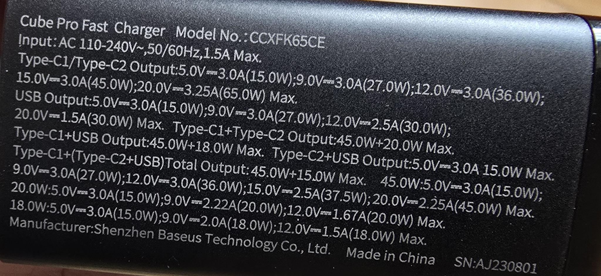 Töltési paraméterek 45W: 5V – 3A (15W), 9V – 3A (27W), 12V – 3A (36W), 15V – 2.5A (37.5W), 20V – 2.25A (45W) max.