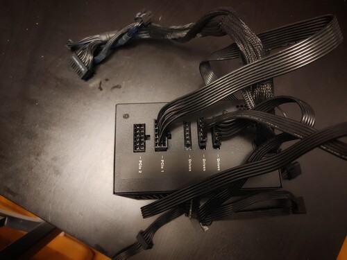 Dobozát sehogy sem találtam, rohadjon meg. A képeken látható madzagokkal (2x8 PCIe (vga), 2 molex, 1x4 pin alaplapi venti(?), 5 sata).