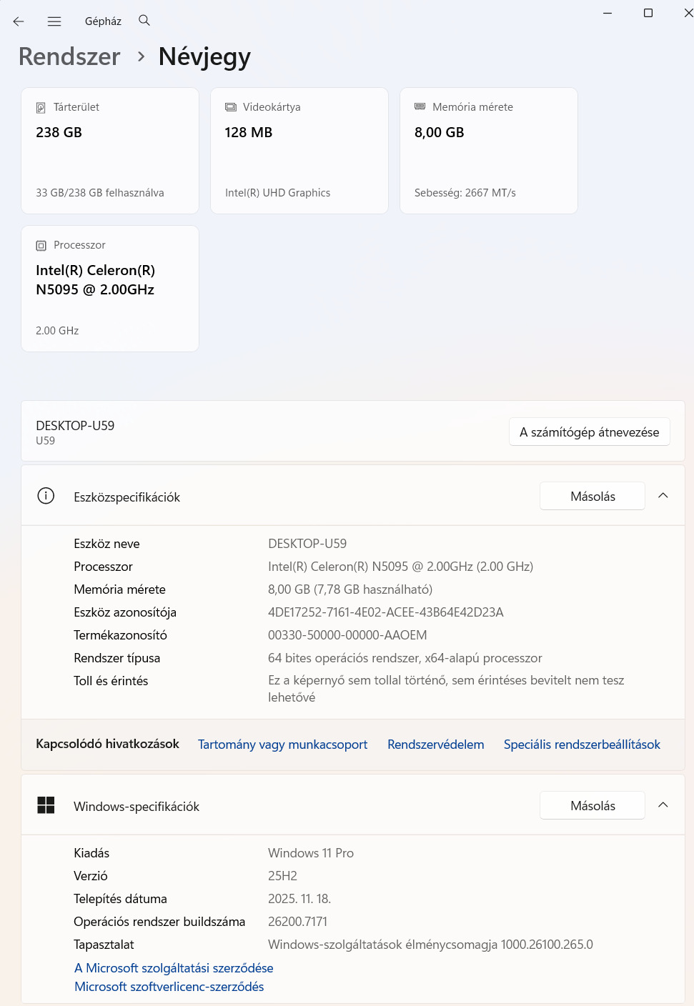 "Ez a számítógép Intel Celeron N5095 processzort kínál, amely 4 maggal és 4 szállal rendelkezik, 4 MB Cache-szel és 2.0GHz alapórajellel, mely Turbo Boosttal akár 2.9GHz-re is képes felgyorsulni. A grafikus teljesítményt az UHD Graphics 600 biztosítja, míg a 8 GB DDR4 memória és a gyors 256 GB-os M.2 SSD optimális sebességet és tárolókapacitást nyújt. A gép előtelepített Microsoft Windows 10 Pro operációs rendszerrel érkezik, mely angol nyelven elérhető, de magyar nyelvű frissítésre és Windows 11 Pro-ra való frissítésre is alkalmas. Gigabit LAN és 802.11 b/g/n/ac Wifi lehetőségekkel rendelkezik, míg az adapter 12V/3A 36W teljesítményt nyújt."