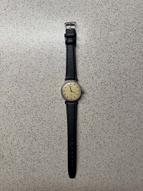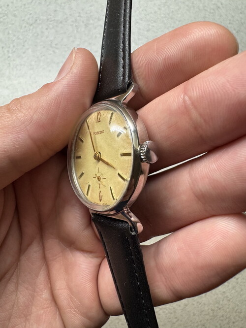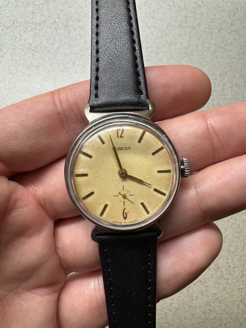 Alsó kismásodperces bikaszarv Pobeda, szervizelt, pontos, patinás számlapú. Új bőrszíjjal.