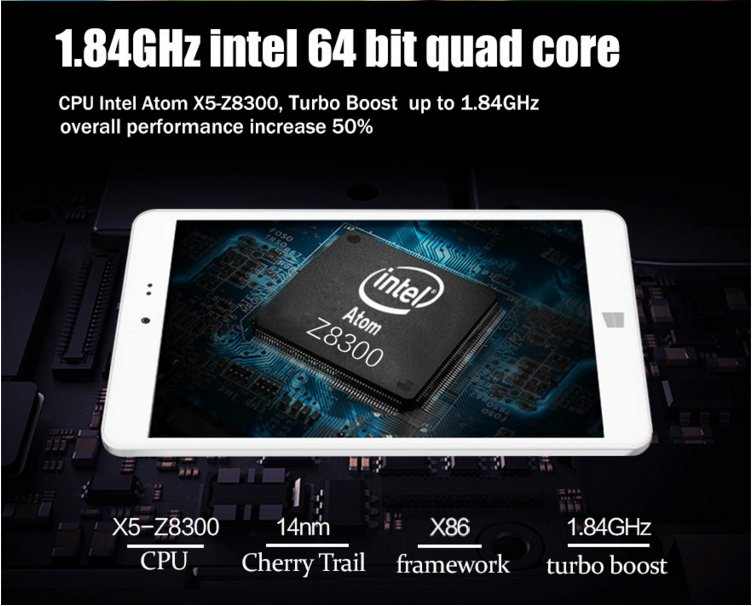 <b>• Intel X5-Z8300 Quad-core CPU</b> (1.44GHz-es alap, és 1.84GHz Turbo órajel)