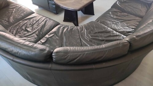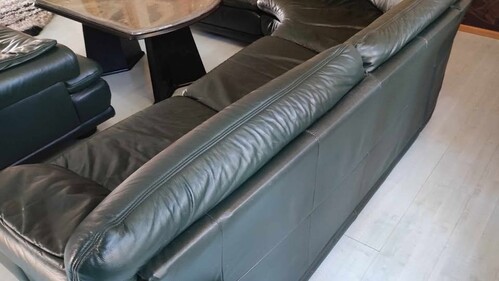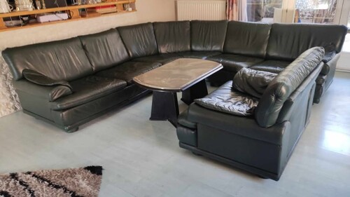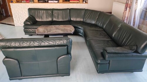 Nagyon sötétzöld, rendkívül szívós vizibivaly bőrből készült. A sarokülő rész 7 személyes + egy fotel melynek háttámláján két egymás feletti hasadás található amik anno a szállítás során keletkeztek. Sarokrész: 280x280x105x80 cm (3 darabból áll) Fotel: 105x105x80 cm, az ülésmelység 60 cm. NEM ÁGGYÁ ALAKÍTHATÓ! Rakodásban, szállításban nem tudok segíteni.