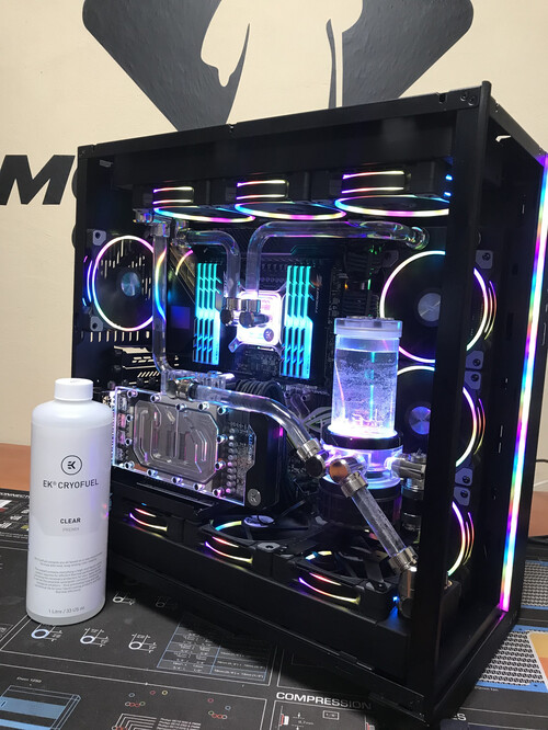 A rendszer 16mm PETG csövezésű, EKWB Cryoufuel friss folyadékkal töltve.