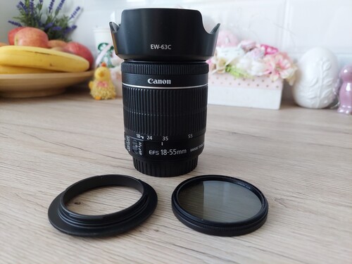 - Canon EF-S 18-55mm 1:3.5-5.6 IS STM objektív (napellenzővel, cirkulációs polárszűrővek és makrofordító gyűrűvel)