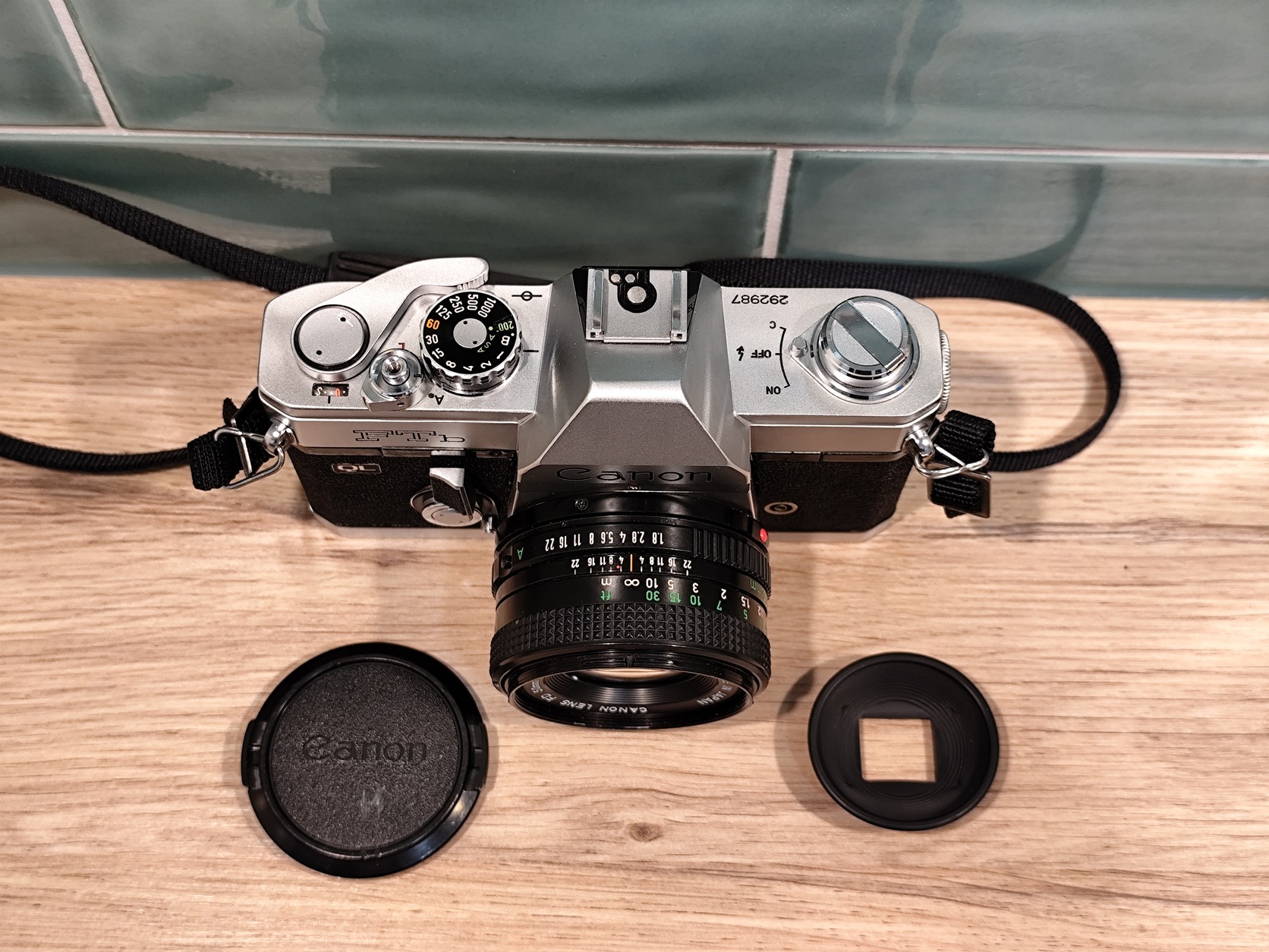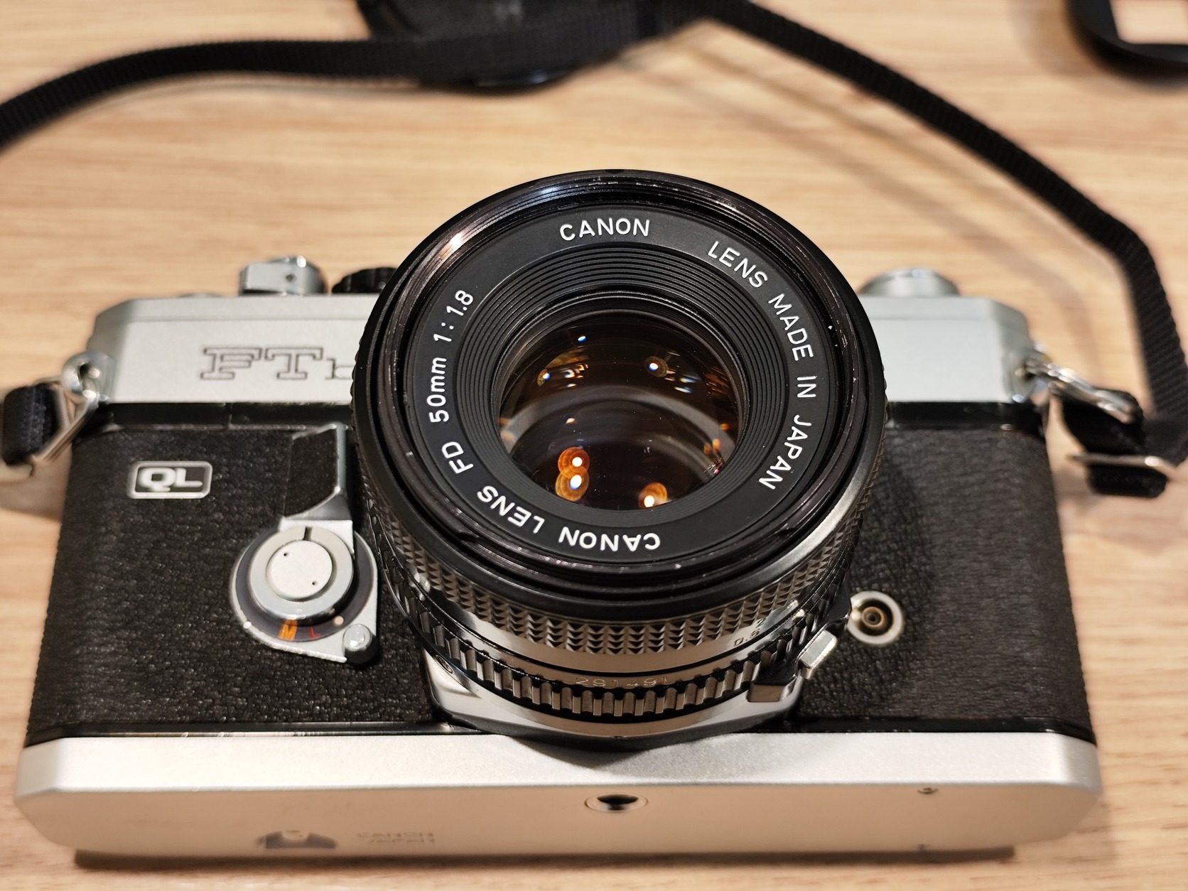 Eladó egy Canon FTb analóg fényképezőgép, Canon FD 50mm f/1.8 objektívvel, Canon sapkával, Canon keresőgumival és Canon vállpánttal.
