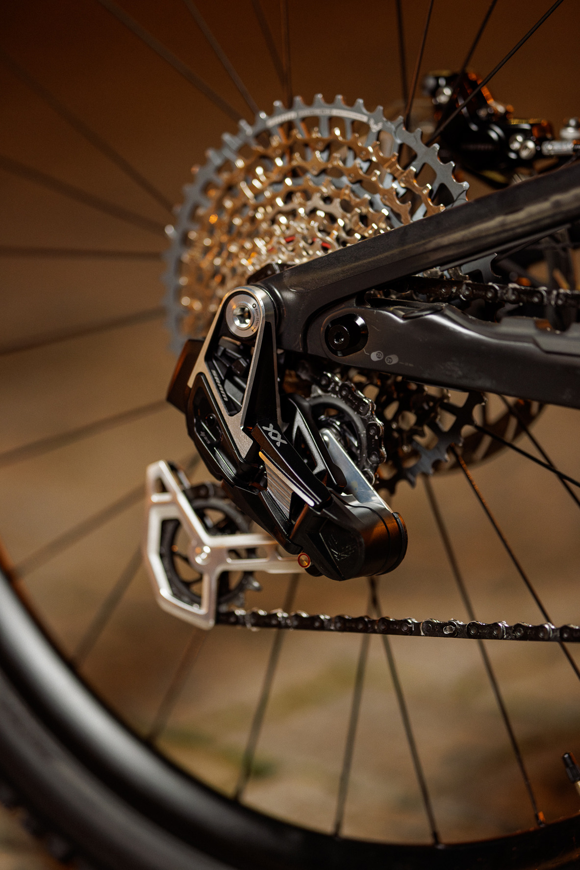 – SRAM XX Eagle Transmission váltórendszer GX sorral, X0 lánccal és AXS Pod Ultimate vezetéknélküli irányítóval