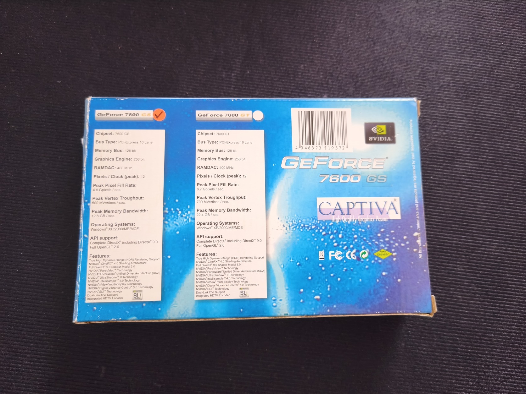 Eladó a képeken látható Captiva márkájú NVIDIA GeForce 7600 GS videokártya. A kártya tökéletesen működik, tiszta, nem volt javítva vagy megbontva. Kiválóan alkalmas retro számítógép építéséhez vagy régebbi rendszerek felújításához.