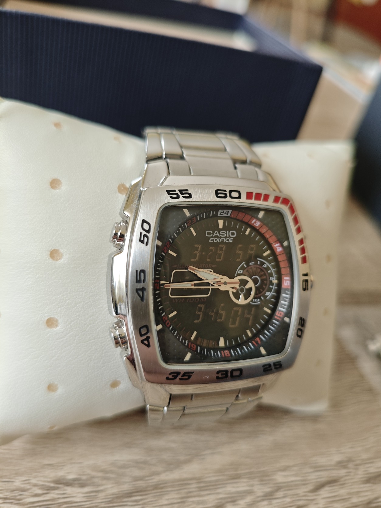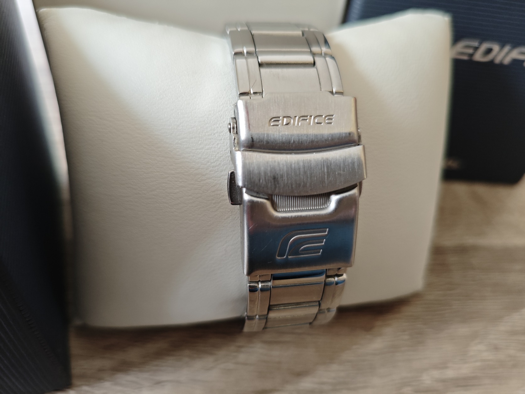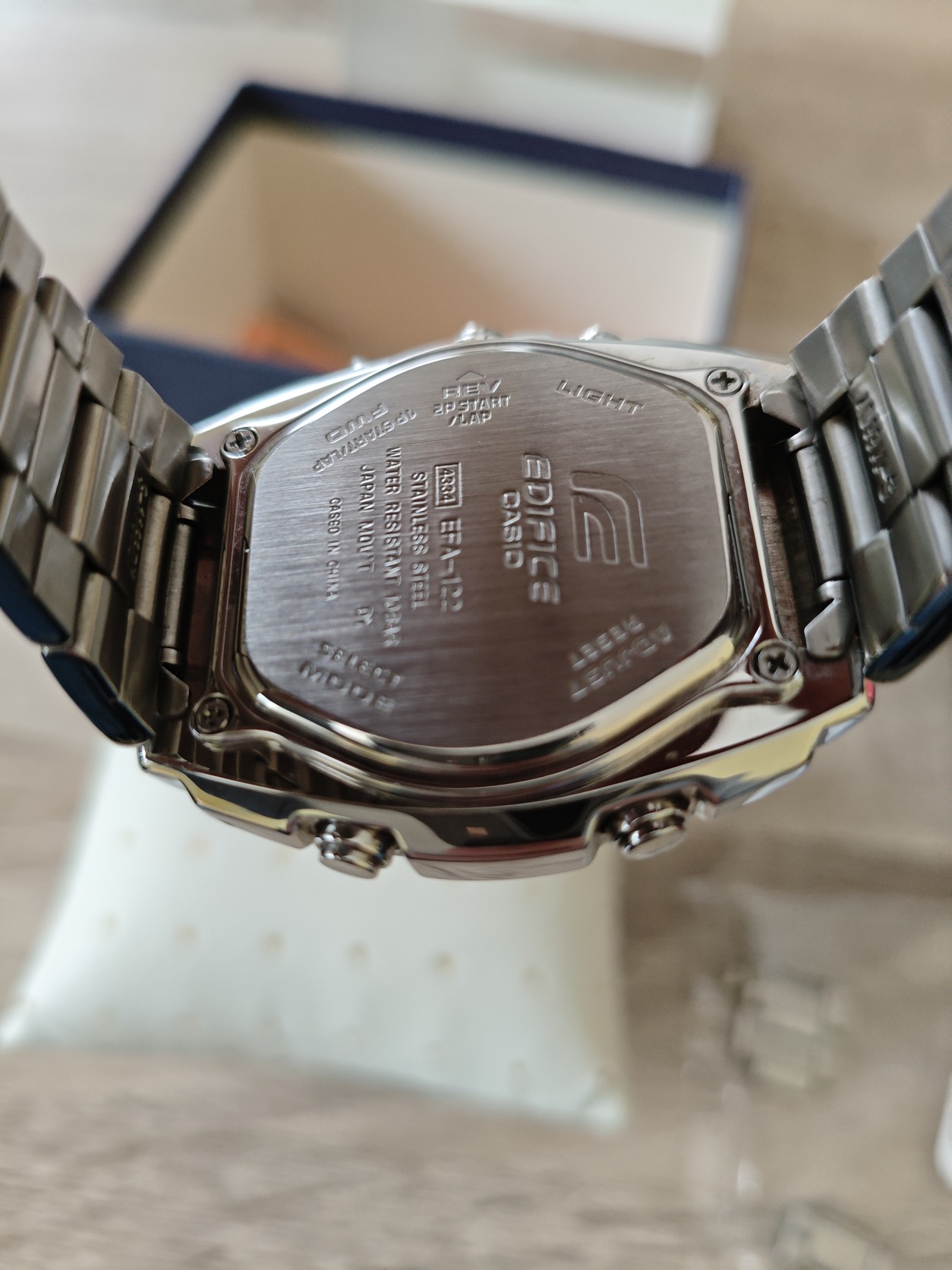 Eladó egy szinte alig használt Casio Edifice EFA-122D-1A férfi karóra gyári dobozában, új elemekkel. Az óraszíj összes kiszedett szeme is a dobozban van.