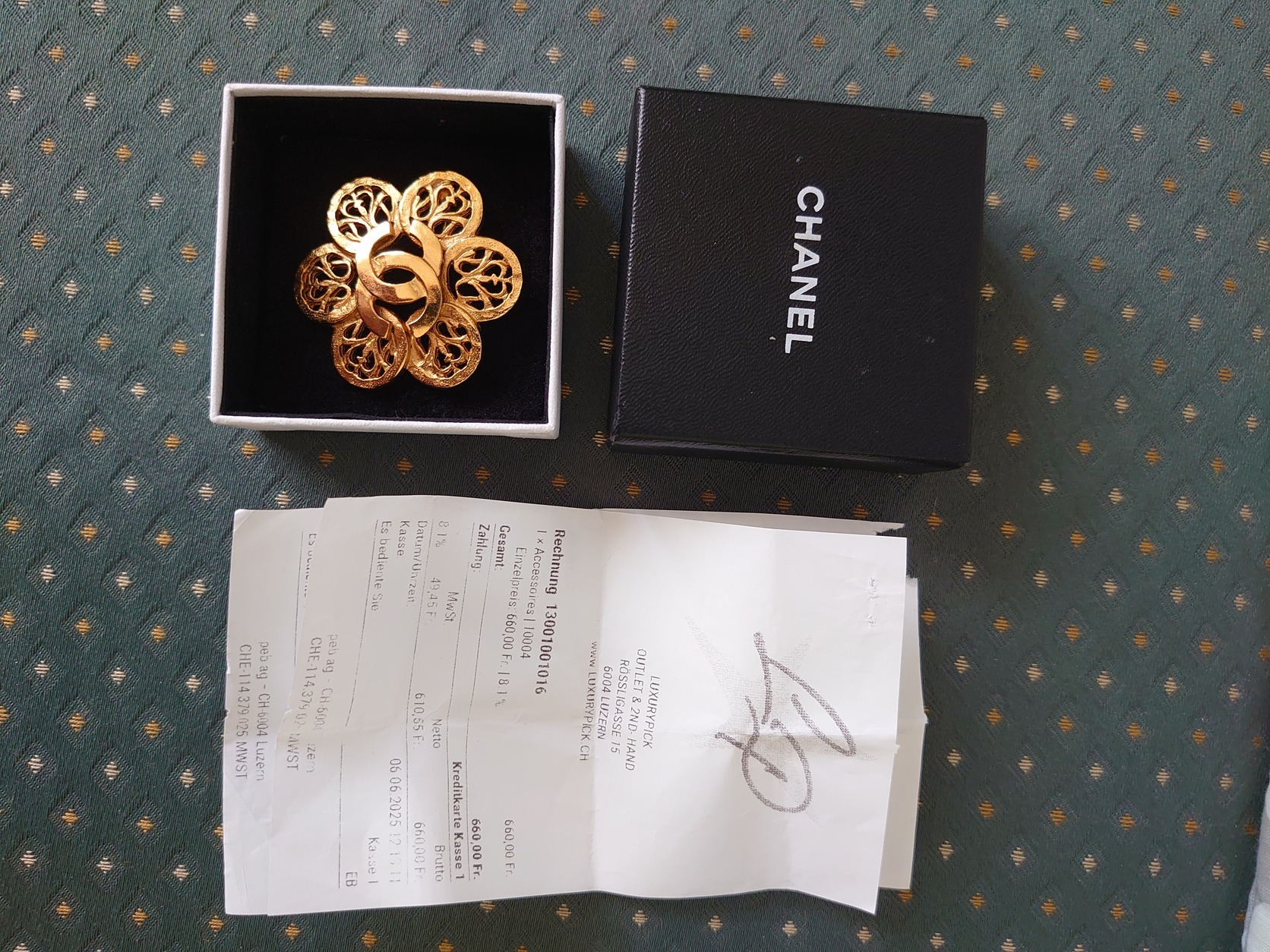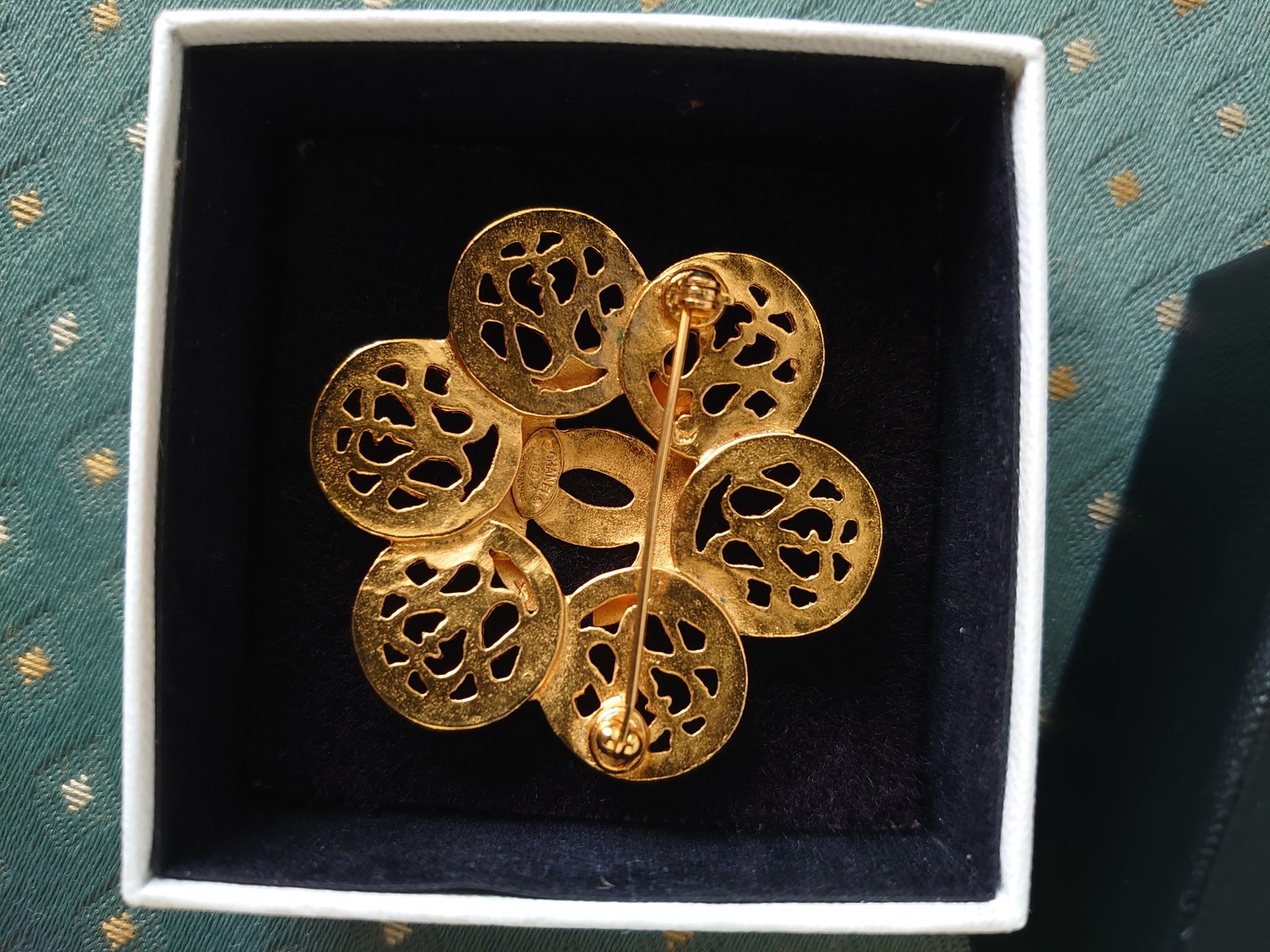 Ez a konkrét modell (a hatos osztatú, kacskaringós áttörésekkel) ritkább, mint a klasszikus kerek vagy sima CC logós brossok. A piacon kevesebb bukkan fel belőle, különösen ilyen jó állapotban, ahol az aranyozás nem kopott meg a széleken.