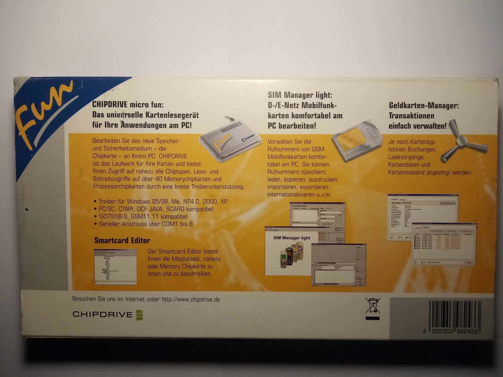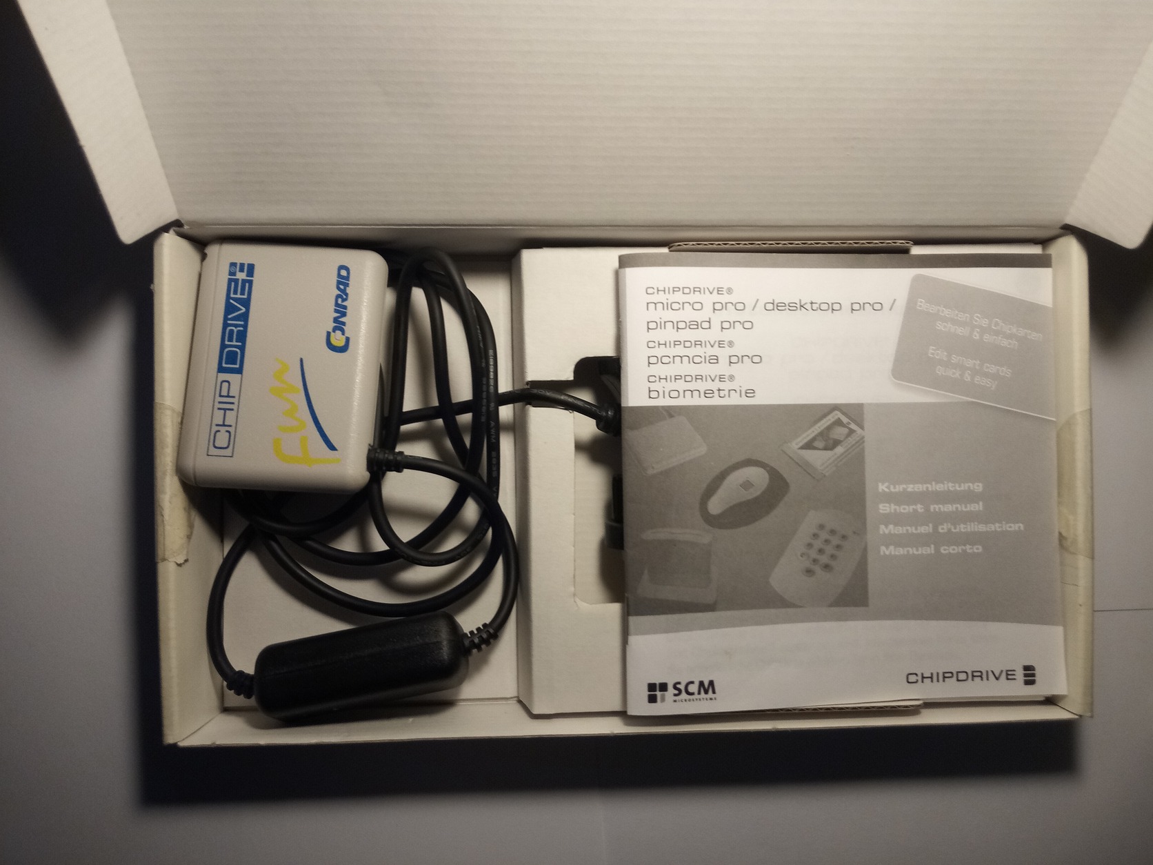 Gyűjtői állapotban eladó egy eredeti Conrad‑márkás CHIPDRIVE® micro fun chipkártya‑olvasó, RS‑232 soros portos csatlakozással, eredeti dobozában, magyar nyelvű eladói címkével és eredeti kézikönyvvel. Ez nem csak SIM‑kezelő, hanem teljes értékű chipkártya‑munkaállomás, több mint 40 féle memória- és processzorkártyát támogat (ISO7816-3, GSM11.11). Kifejezetten ritka, korai generáció, hazai Conrad szaküzletből (Teréz krt. 23.), eredeti ár címkével (6 710 Ft), rendelési számmal (967930), és német gyártású belső sorozatszámmal (07878001).