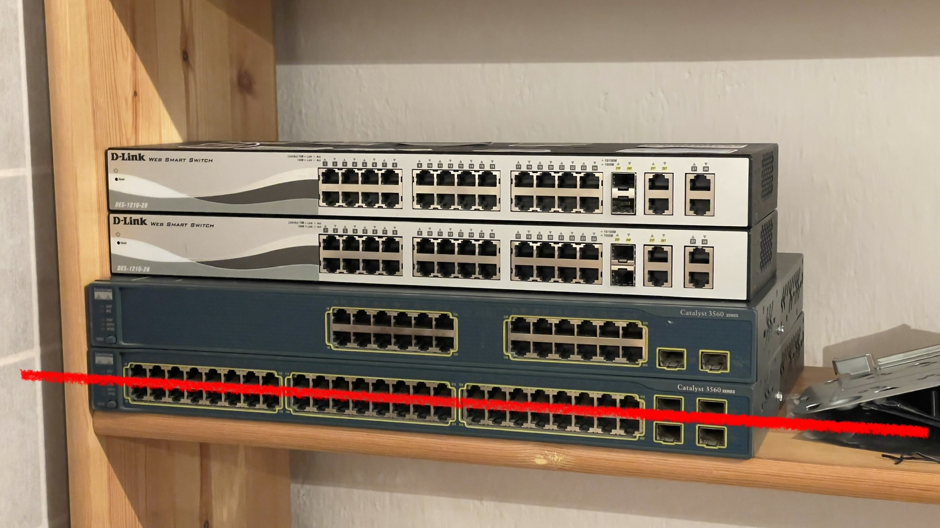 2× Cisco Catalyst 3560 (IP Services IOS) 2× D-Link DES-1210-28 Web Smart switch