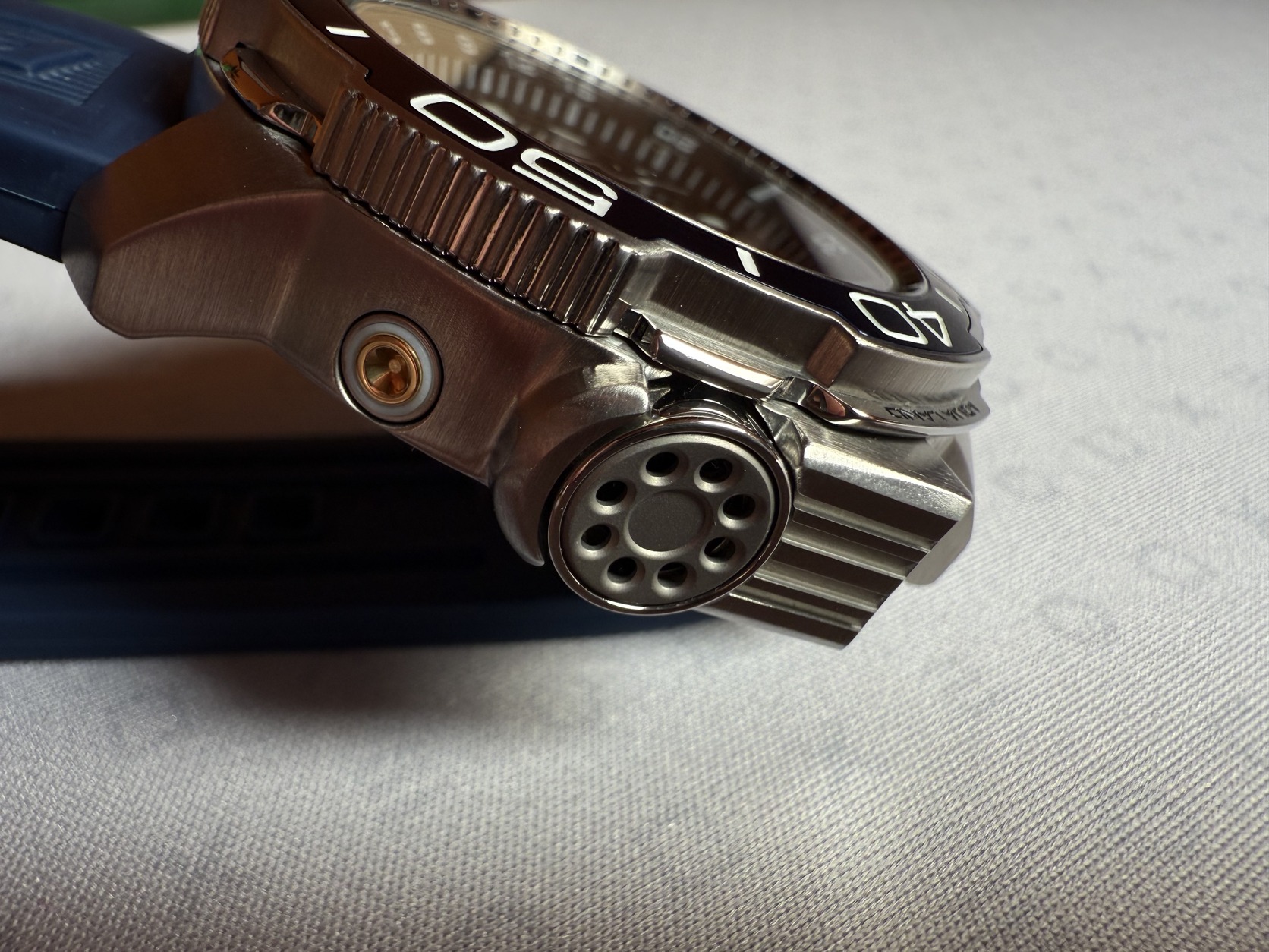A tok, a lünetta valamint a zafírkristály üveg karcmentes, a csat végen valamint a hátlapon minimális hajszálkarcok találhatóak, de csak akkor észrevehetőek, ha az ember nagyon közelről vizsgálja.