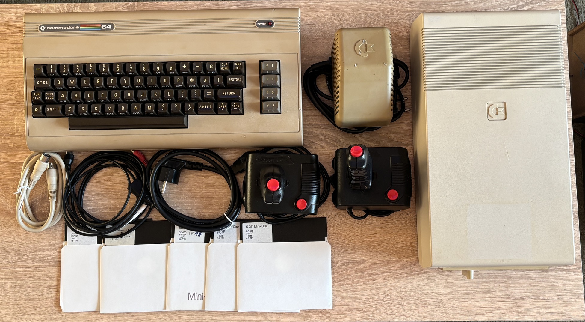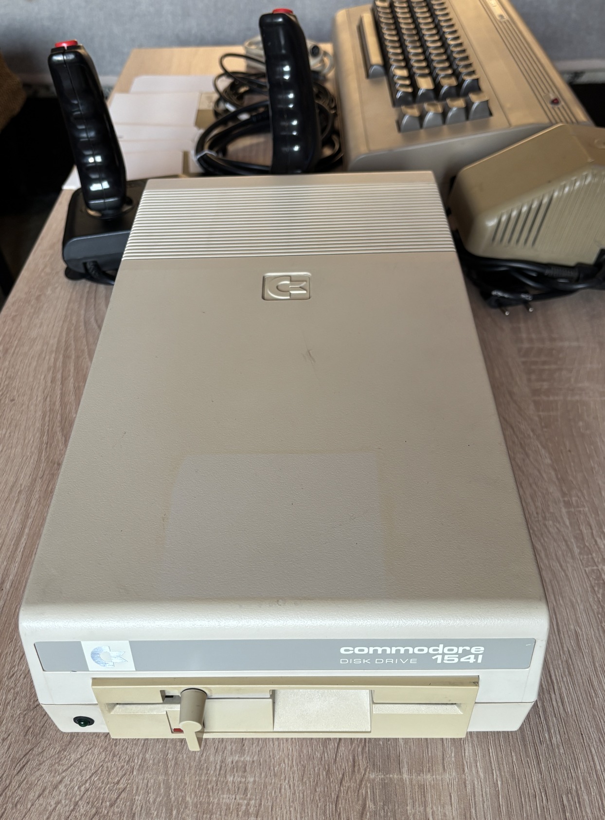 -Floppy meghajtó: Commodore 1541C, minimálisan sárgult, a képen látható állapotban, összekötő serial- és tápkábel jár hozzá. Olvasásra, írásra, formázásra tesztelve, csendesen működik.