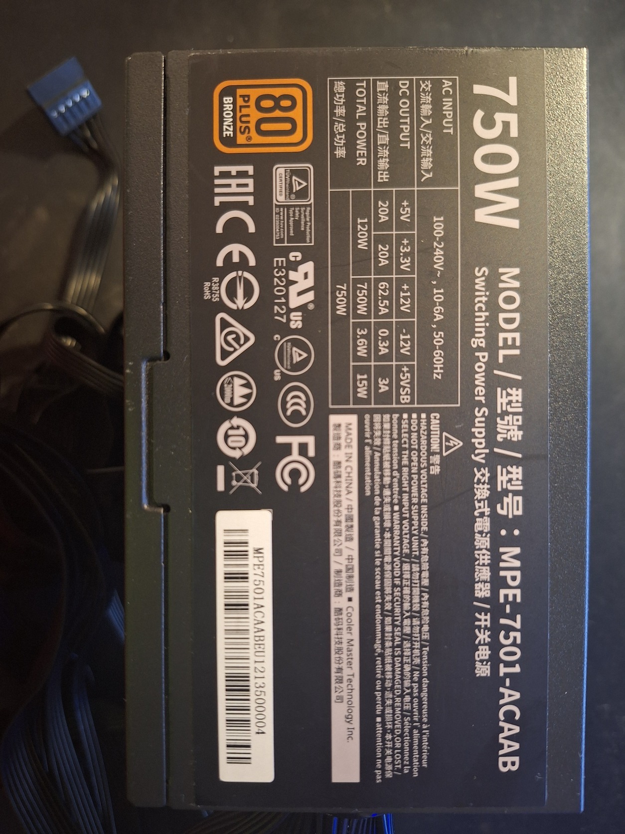 PC tápegység - 750W, ATX, 80 PLUS Bronze, 85% hatékonyság, 4 db PCIe (8-pin / 6+2-pin), 8 db SATA, aktív PFC, termikus sebesség szabályozó, power switch, DC-DC átalakítók és dual EPS, 120 mm-es ventilátor, nem moduláris, 140 mm mély