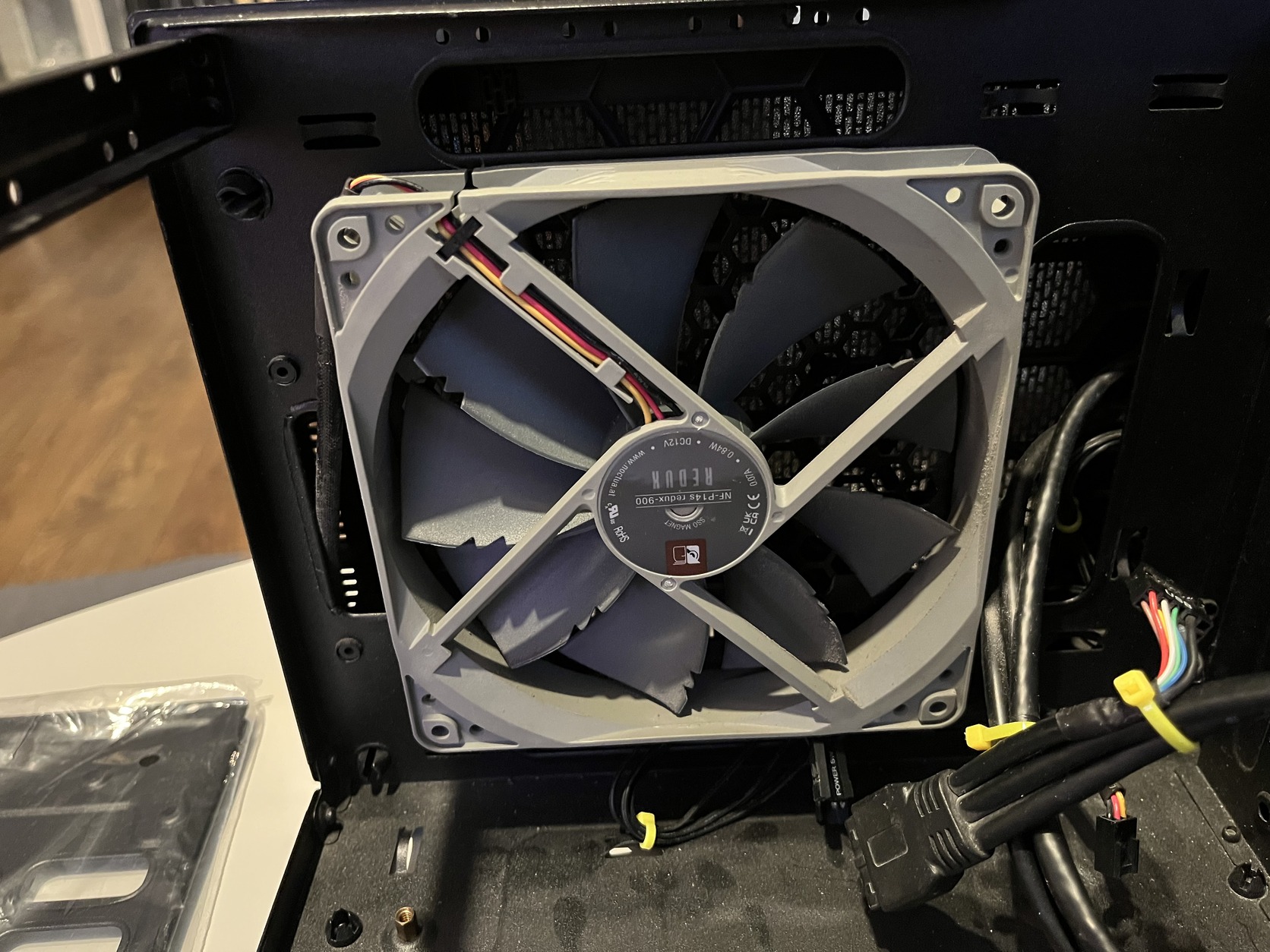 A házban van egy 14 cm-es Noctua venti. Ez, és a táp hűtése elég jól átszellőzteti a kis házat.