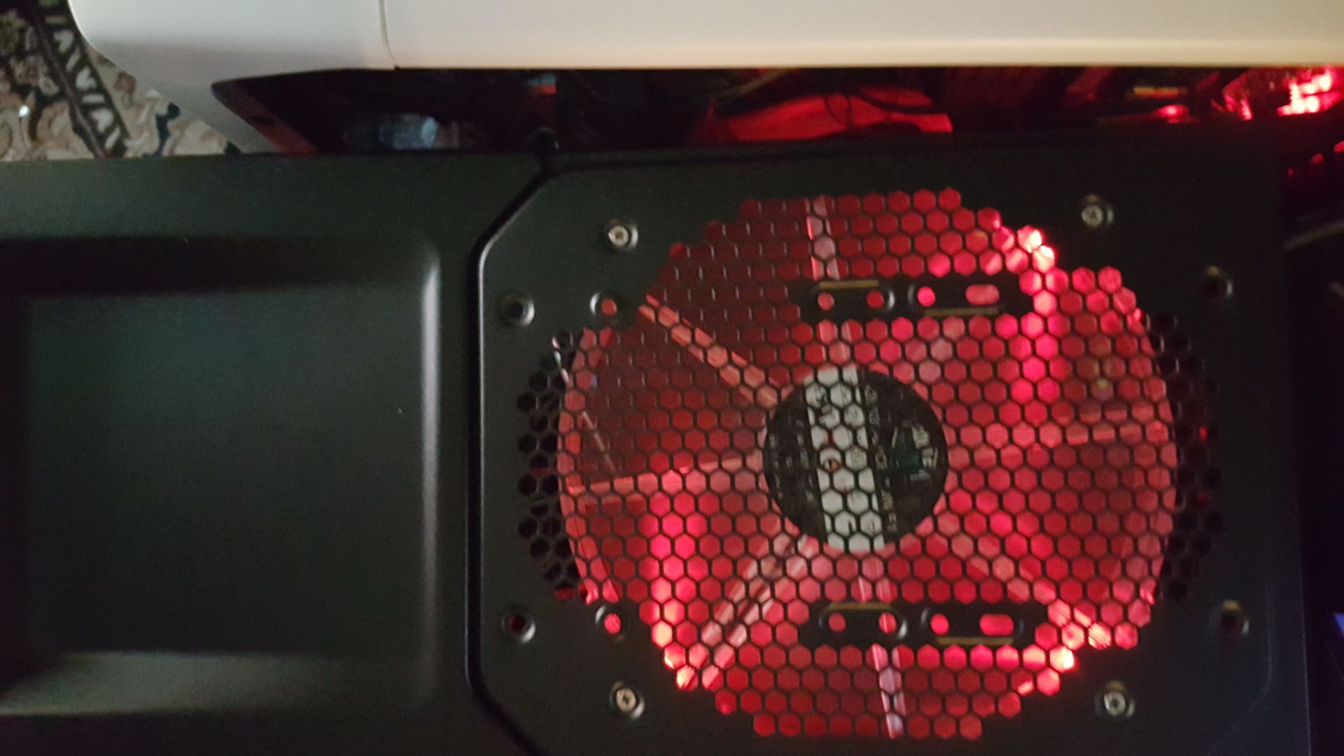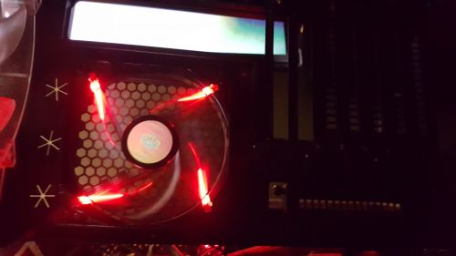 Két 20cm-es Cooler Master piros világítású ventilátorral elől,felül és egy 14cm-es Cooler Master piros világítású ventilátorral hátul.