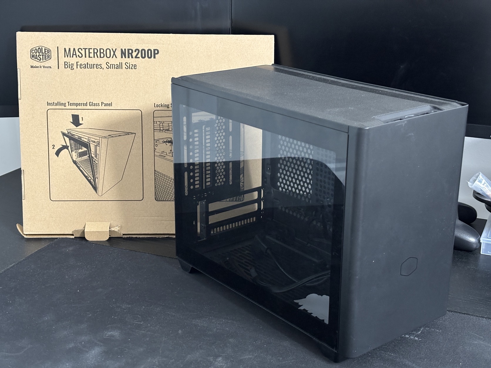 Üveglappal volt használva, de természetesen a mesh oldala is hozzá jár. Riser kábel nem járt vele anno, így az most sem a csomag része.