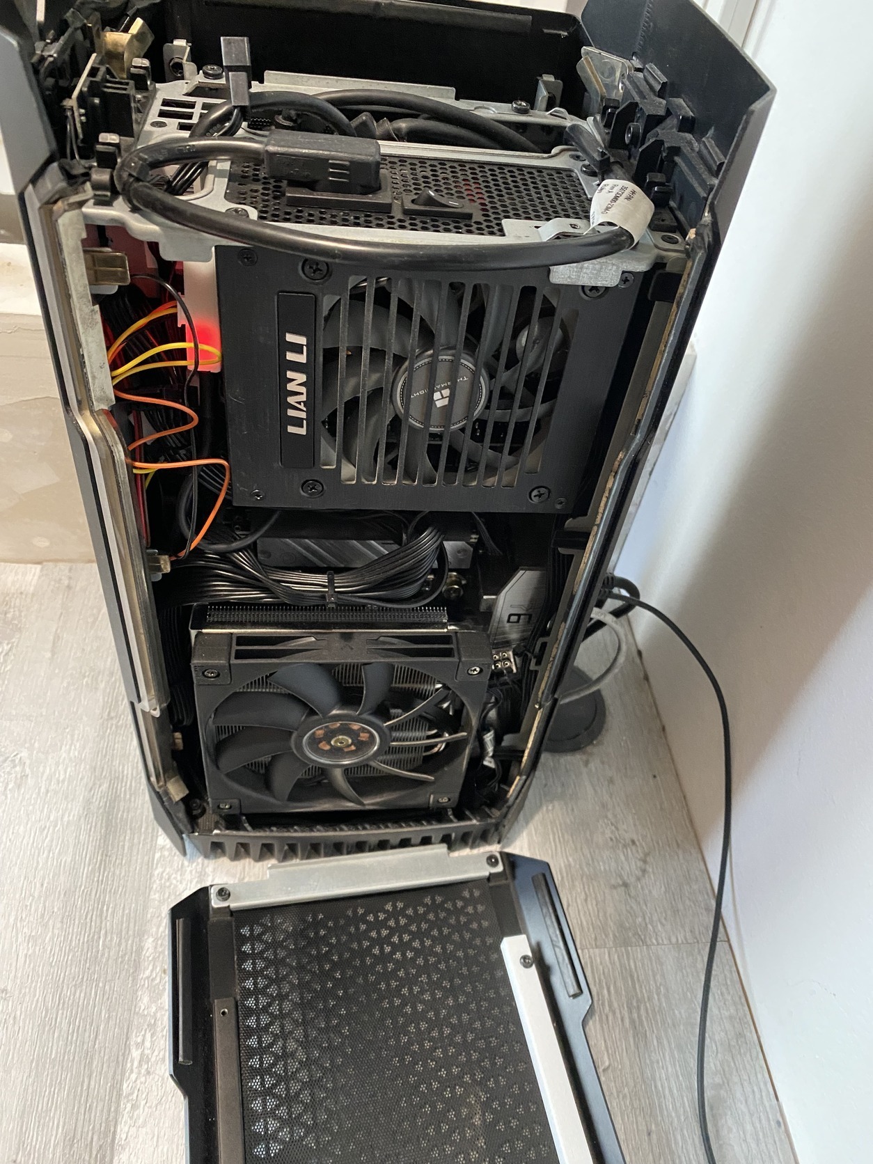 - A házon egyetlen egy végleges módosítás van: A tápkábel átvezető szakszerűen meg lett hosszabbítva, hogy az SFX tápot be lehessen 180 fokkal elforgatva is szerelni. (Hogy kintről befele szívjon, ne a VGA felől.) A hossza nem befolyásolja a szerelés irányát, mindenhogy elfér, nincs rajta feleslegesen sok hosszabbítás.)