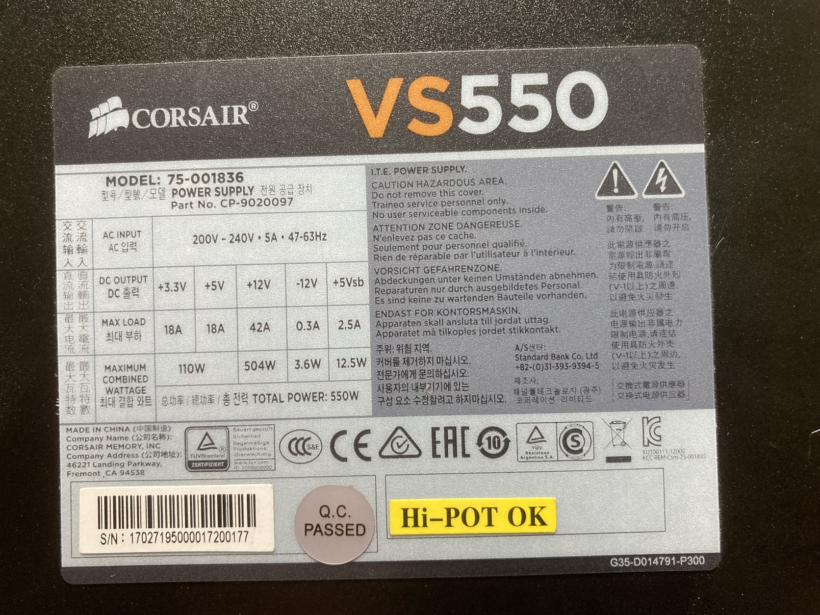 Corsair VS 550 Tápegység