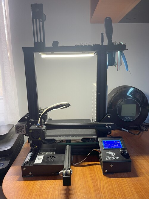 Eladó a képen látható Creality Ender 3 FDM 3D nyomtató. A gyárihoz képest egy SKR Mini E3 V3 alaplap van benne, amivel szépen csendesen teszi a dolgát és csak a ventilátorok hangját lehet észrevenni. Kapott egy világítást. (Szabályozható vagy akár ki is kapcsolható.) A géphez jár egy új Creality carborundom üveg építőlap. Az összes gyári tartozékával eladó. Kevesebb, mint 3 kg anyag lett elhasználva rajta, mert a használója inkább a gyantás nyomtatást részesíti előnyben. :)