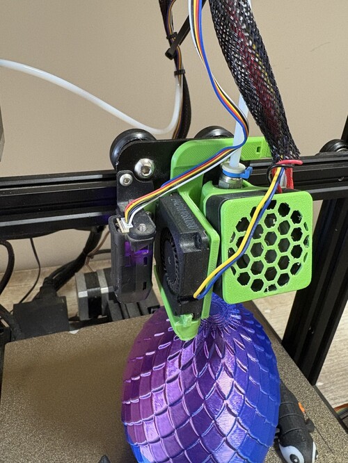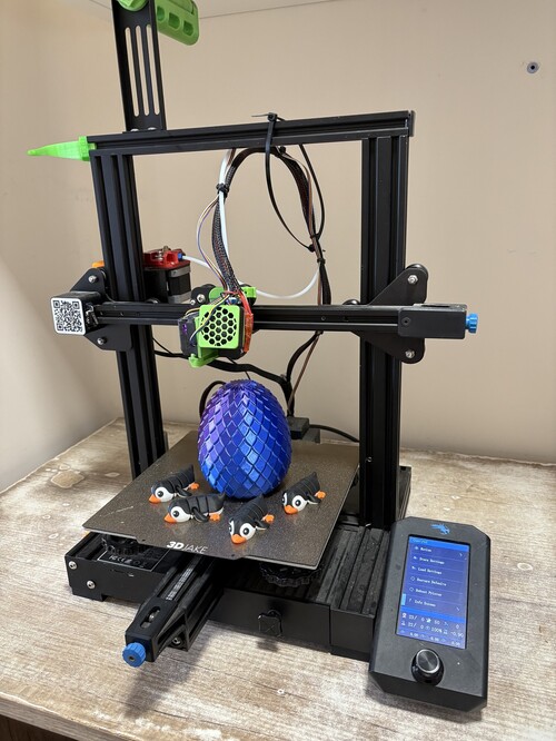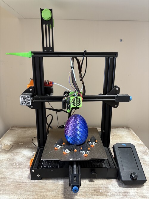Foglalkozós, X tengely mozog, gyári ventilátor háza elolvadt picit ezért kapta azt a zöld valamit, van hozzá pár darab használt pót fúvóka. Egyébként kis tárgyakat szépen nyomtat. Alkatrésznek is jó.