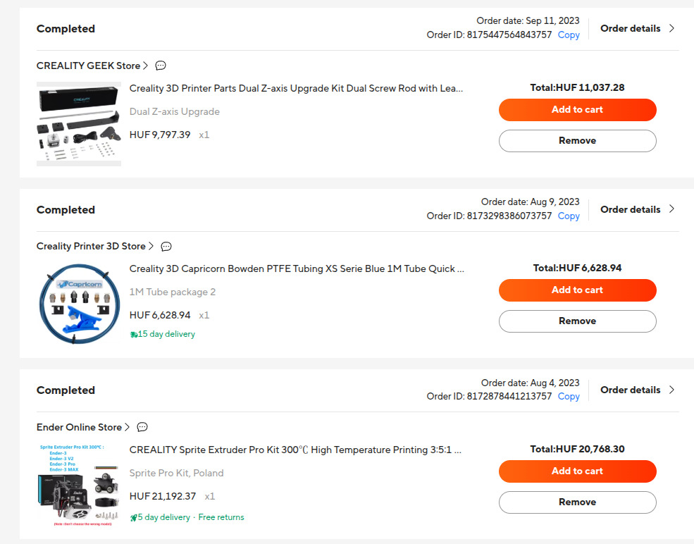 Csatoltam az aliexpress-es rendeleseket, a BLTouch viszont alzas volt, ahogy a PEI lap is.