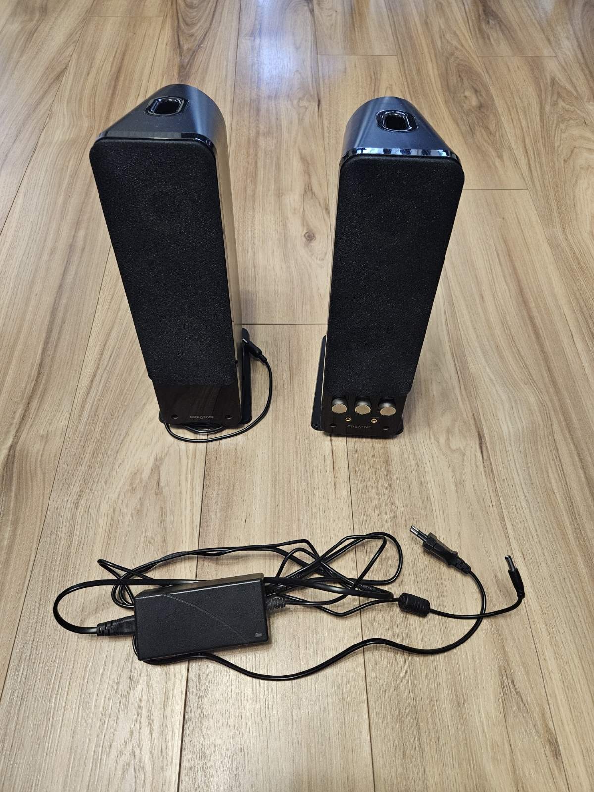 Csak maga a hangszórópár és a tápegysége (doboz, egyéb kábelek nélkül), a képen látható módon.