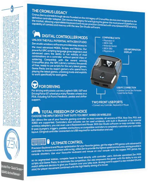 A Cronus Zen a legerősebb videojáték-vezérlő átalakítási technológiát kínálja. Lehetővé teszi, hogy kedvenc licencelt kontrollered minden játékplatformon, azaz Xbox, Playstation, Switch és Windows platformon használd. Támogatja az Xbox Series X|S, Xbox One és Xbox 360 konzolmodelleket, a legtöbb licencelt Xbox-vezérlőt, beleértve az Elite Series 2-t, a Scuf Prestige-t, a Razer Wolverine Tournamentet, a PlayStation 4 és 3 modelleket, a PS4 Pro-t és a kontrollert, a DualSense-t, az Astro C40 TR-t, a Nacon Revolution Pro 3-at, a Scuf Vantage 2-t, a Nintendo Switch és TV Dock modelleket, a legtöbb licencelt vezetékes vagy vezeték nélküli Switch kontrollert, beleértve a népszerű Nintendo Joy-Conokat és a vezeték nélküli Switch Pro vezérlőt. A készülék támogatja az USB, a Bluetooth és a Dual Bluetooth funkciót. Vezetékes és vezeték nélküli vezérlőket csatlakoztathatsz Windows 11-es számítógépedhez, és hozzáférhetsz a kompatibilis szkriptekhez, makrókhoz és GamePackekhez. A Cronus Zen készüléket biztosan minden játékos értékelni fogja.
