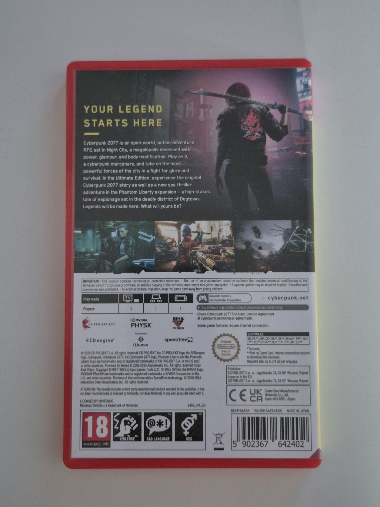 Eladóvá vált a Cyberpunk 2077 Ultimate Edition Nintendo Switch 2 konzolra. A kártyán a teljes alapjáték és az Ultimate kiegészítő is megtalálható, külön letöltés nélkül, minden tartalom rajta van.
