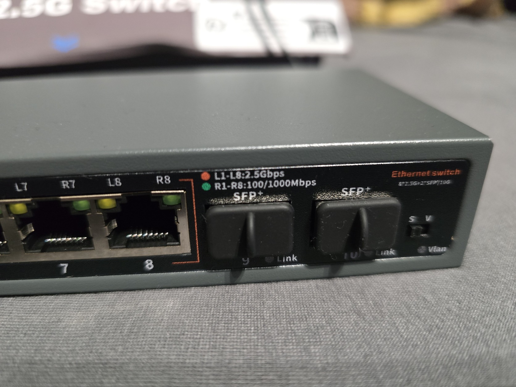 A készüléken 8 db 2,5 GbE sebességű lan (RJ45) csatlakozó és 2 db nagy sebességű SFP 10GbE csatlakozó található.