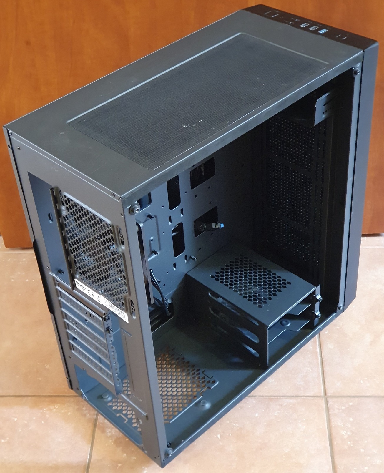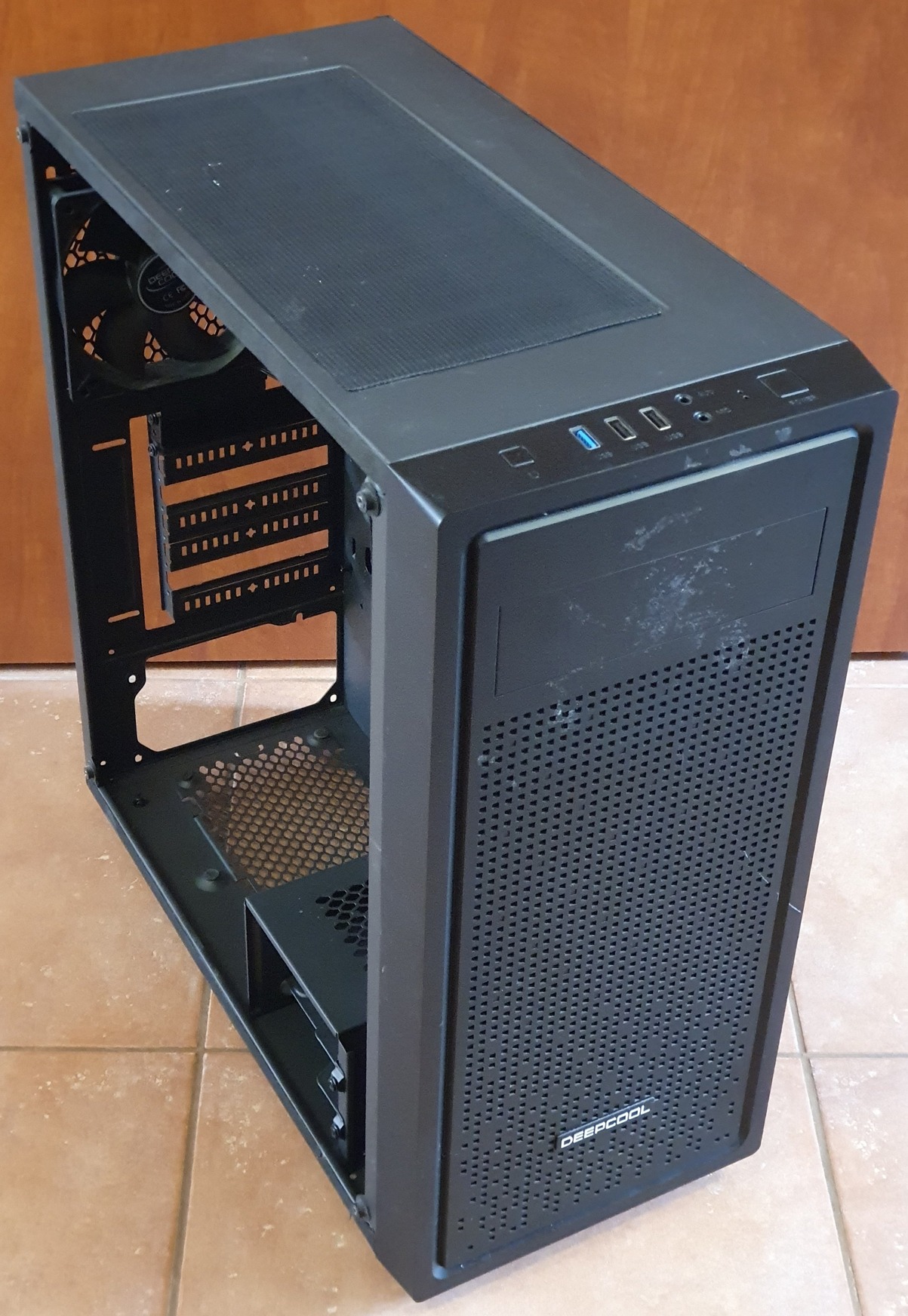 Üveg oldallapok és azokat lefogató gumis csavarok hiányoznak. Ezt leszámítva minden működik. A gyári kábeleken kívül egy 12cm-es rendszerhűtő van benne.