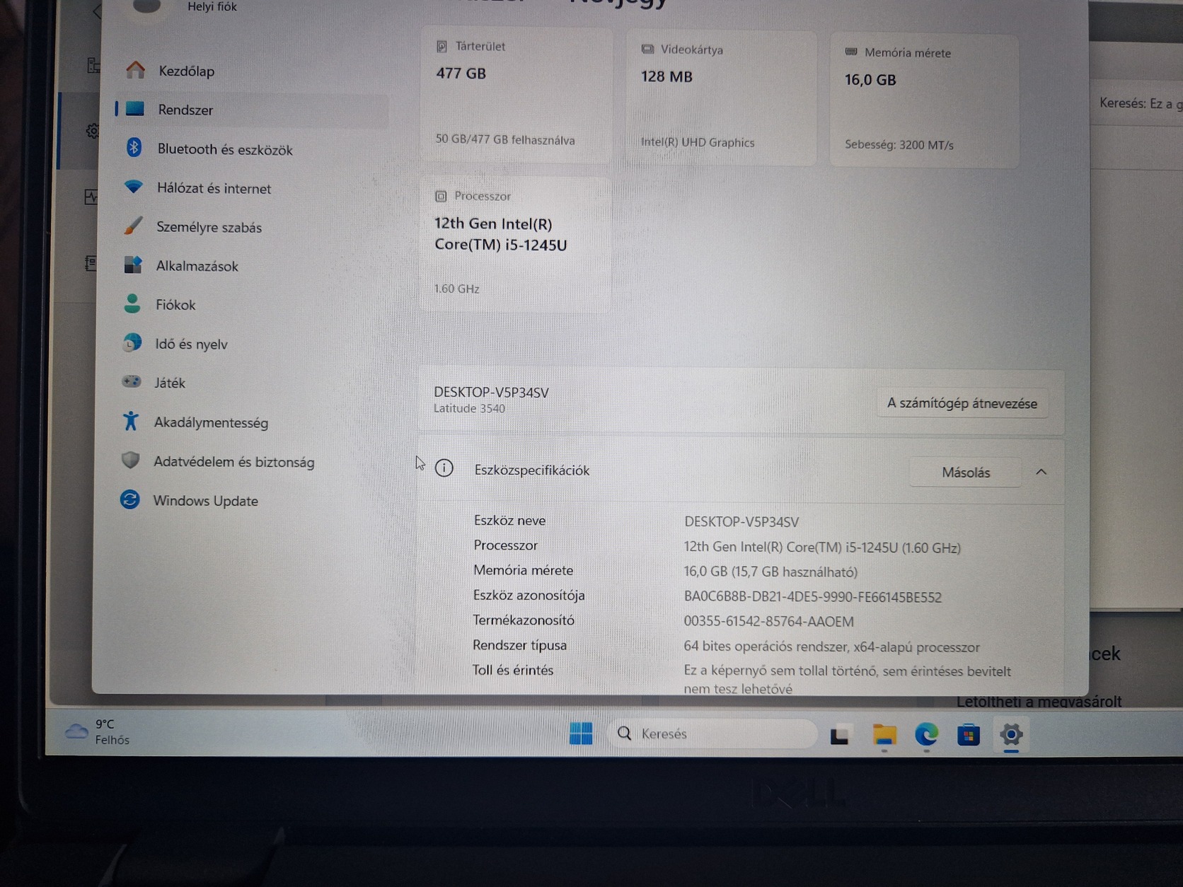 – CPU: Intel Core i5-1245U (10 mag, 12 szál – 12. generáció)