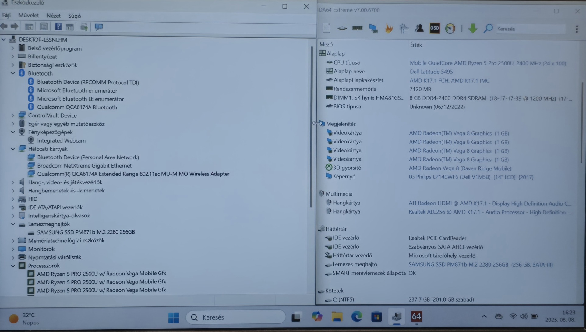 Dell Latitude 5495, 14" FHD IPS, Ryzen 5 Pro 2500U, 8GB DDR4, 256GB SSD, W11, Számla, 1 év garancia ( olvasd végig )