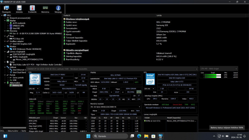 Akkumulátor kapacitás: 94%-os (Hwinfo: 5.7% elhasználtság), 2024 elején új akkut kapott