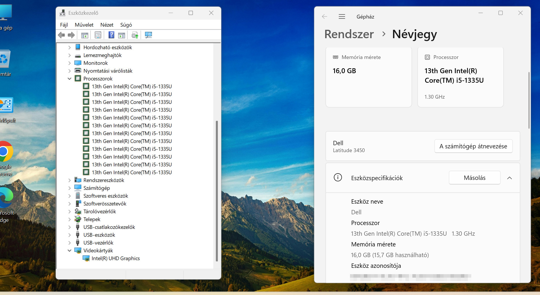 - Videókártya: Intel Iris Xe (jelenleg Intel UHD Graphics-ként üzemel, mivel 1 db memória modul van a gépben, Iris Xe üzemmódhoz 2 db memória modul (dual chanel mód) kell