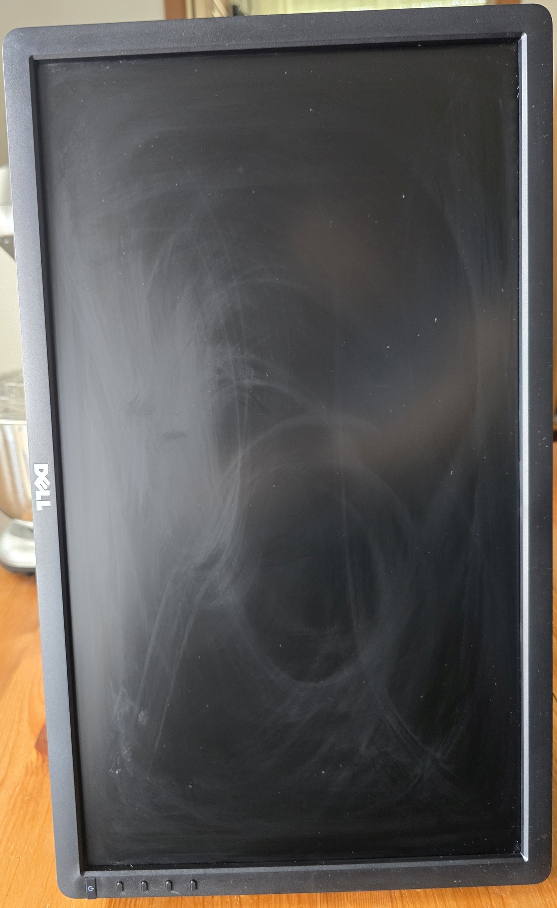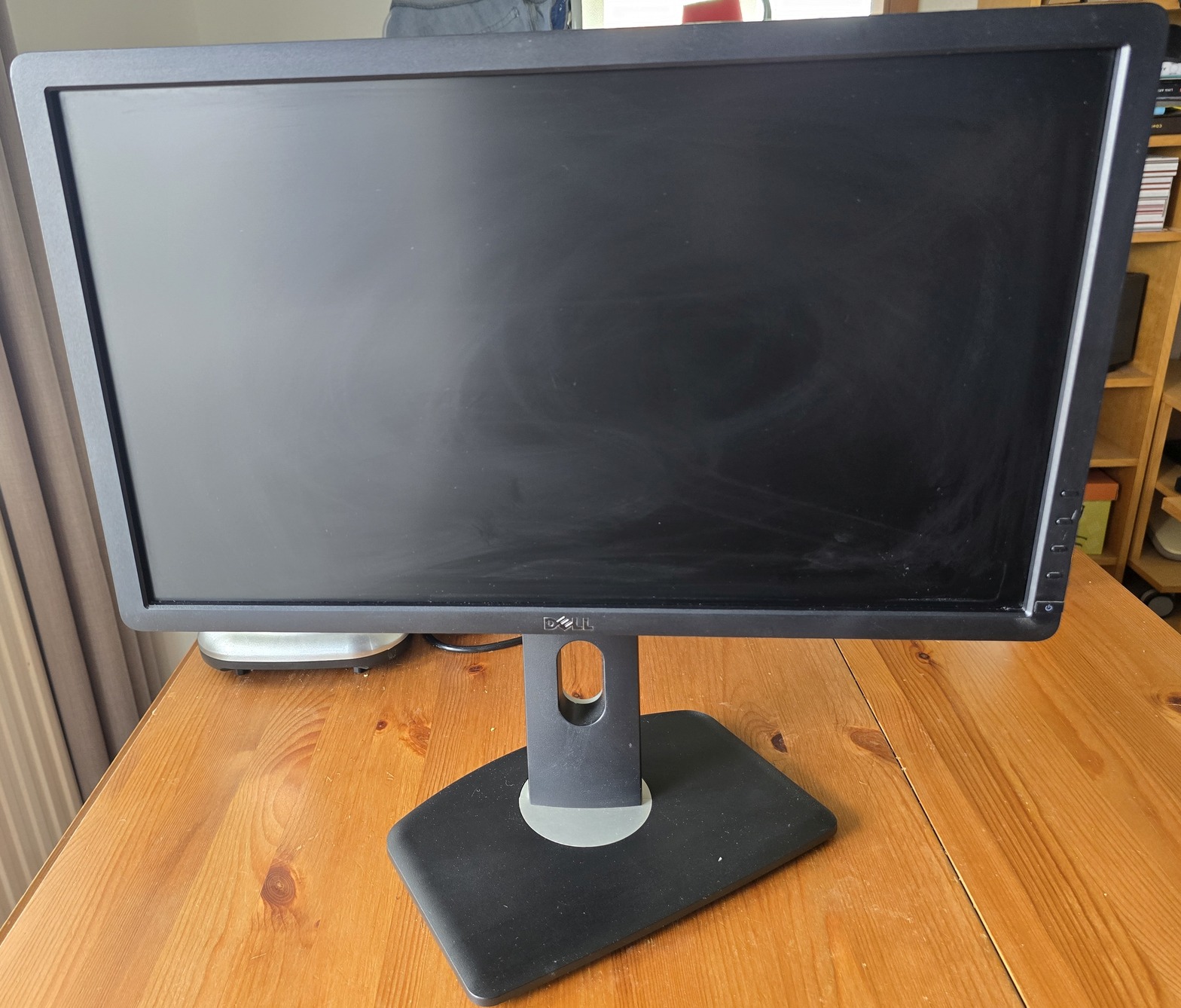 Képen látható állapotban, próbáltam fotózni. Felület sérülés nem látható. Langyos vizes ronggyal próbáltam letörölni, annak nyomai láthatók a képernyőjén. Eddig irodai környezetben volt használva egy dell géppel 3 monitoros összeállításban.