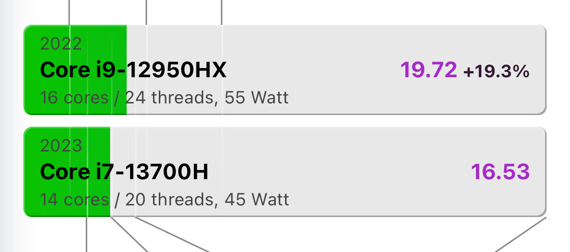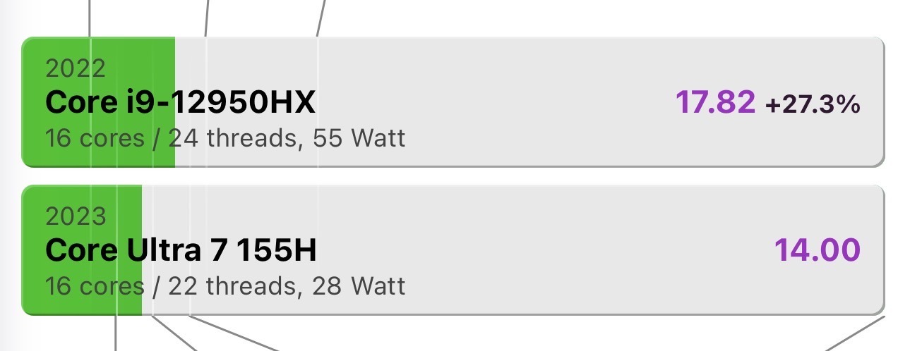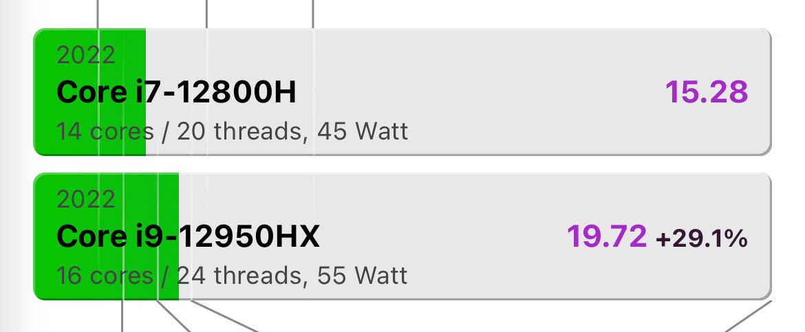 Intel Extreme HX sorozat, ami még a H-tól is erősebb, nem beszélve a gyengécske U, G, P processzorokról. (pl. 52%-al erősebb, mint az i9-11950h, 29%-al, mint az i7-12800H, 19%-al, mint a 13800H és 27%-al mint az ultra 7 155H)