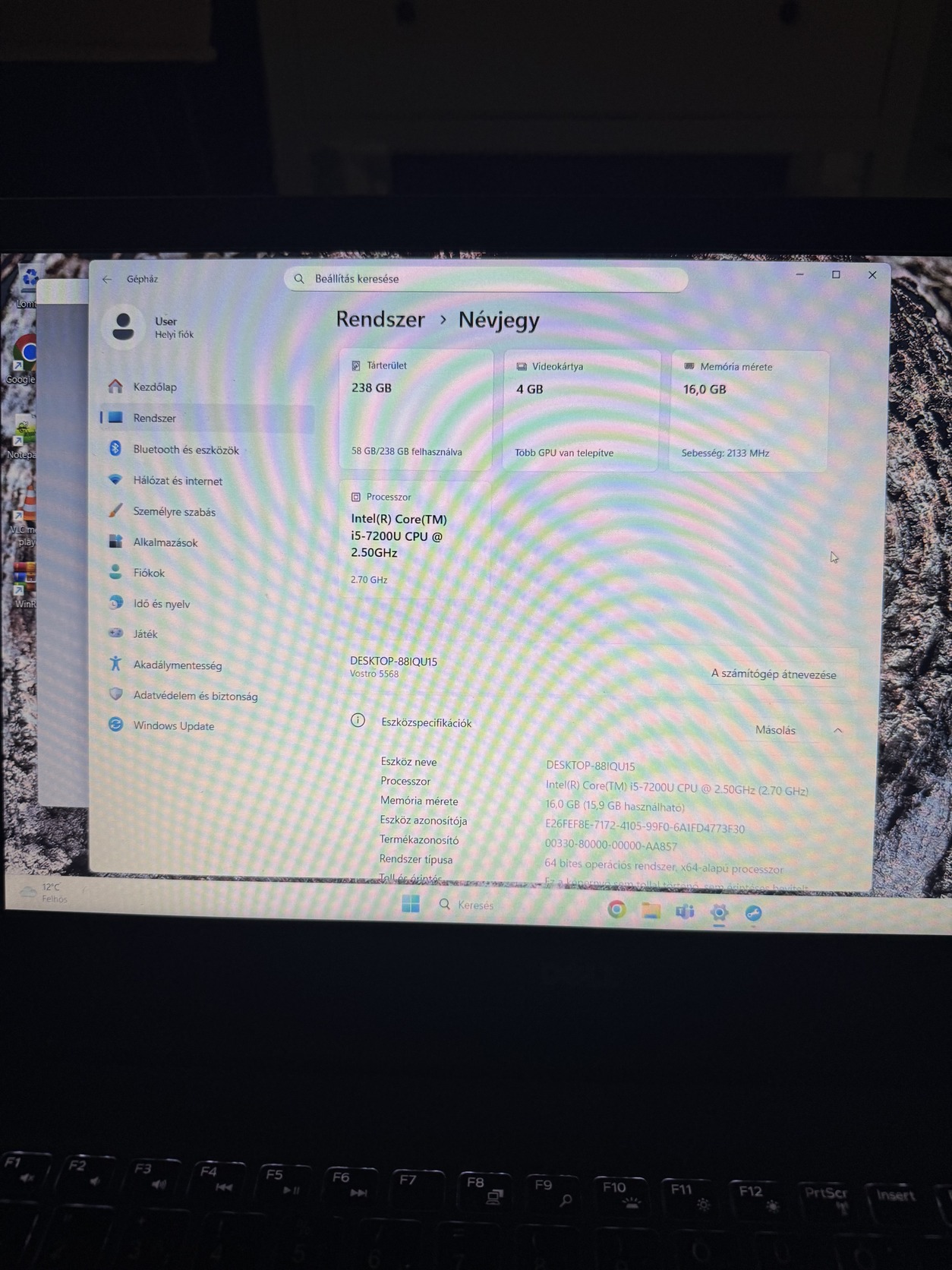 Eladó megkímélt állapotú Dell Vostro 5568 laptop. A gép tökéletesen működik I5 7200u processzorral, Gedorce 940MX videórártyával,16Gb ram, 256Gb ssd. Az akkumulátor közepes állapotú megközelítőleg 1órát bír. Jelenleg aktivált Win11 fut rajta. A bill világítós magyarra matricázott.