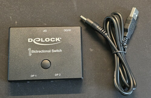 Eladó egy Delock displayport switch. Kétirányú, tehát egy monitoron két input választható, vagy egy gép képe kapcsolható egyik/másik monitorra. Jelfeldolgozás nincs benne, direkt kapcsolós; így nem befolyásolja a sávszélességet vagy a VRR (G-sync / FreeSync) működését. 5V tápellátást igényel, USB-s tápkábel tartozék.