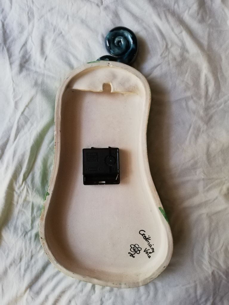 Czékmány Vera keramikus által készített és szignózott, körte alakú dizájn falióra.