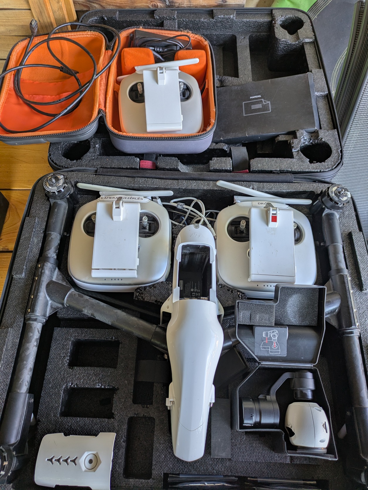 Eladó DJI Inspire 1 drón a képeken látható tartozékokkal és kiegészítőkkel.