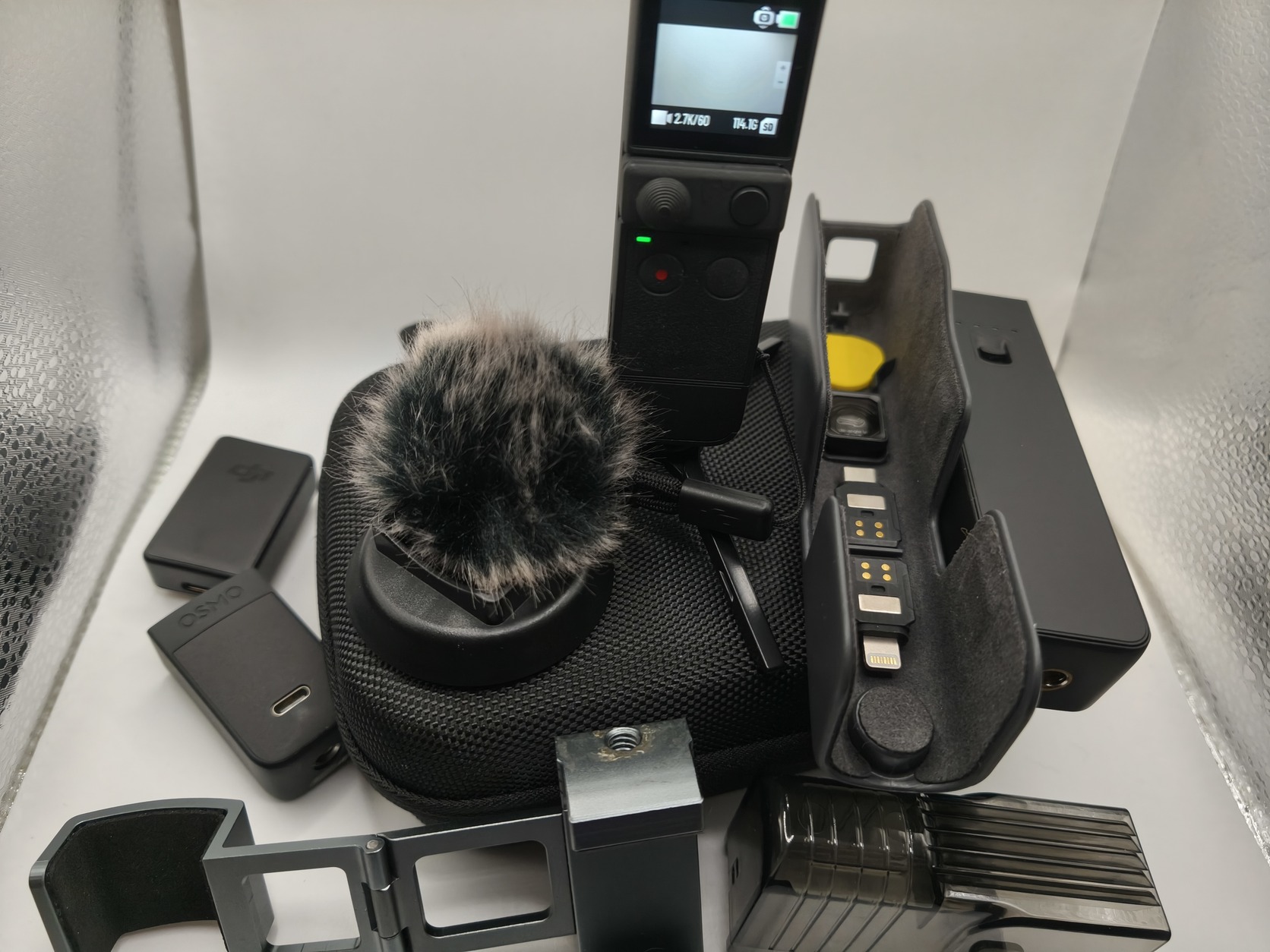 - Gimbal- és kijelzővédő tok (kisebb, mint az eredeti tok, így még könnyebb zsebben tartani a kamerát)