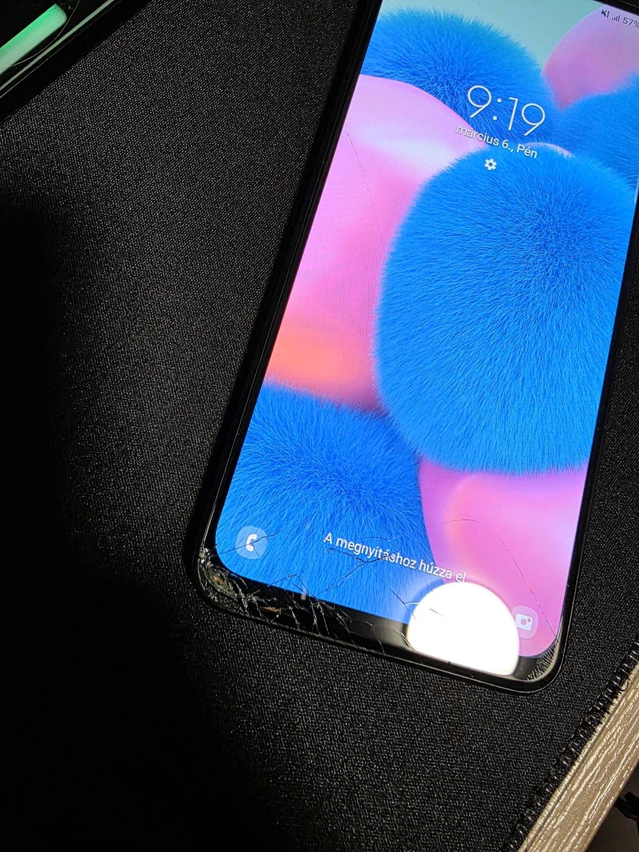 Leejtés miatt az előlapi üveg repedt/törött, a készülék keretén is található ütődés.