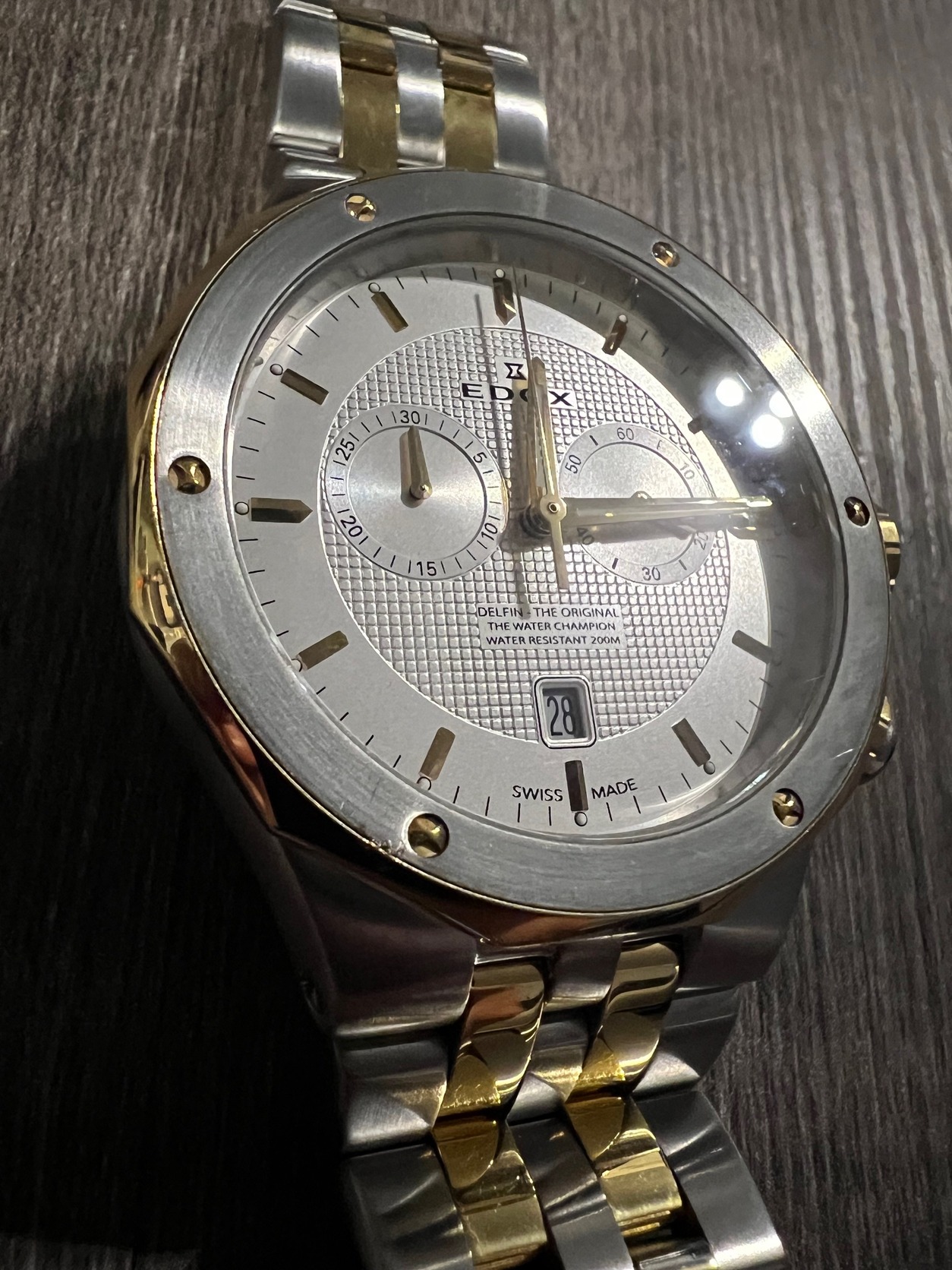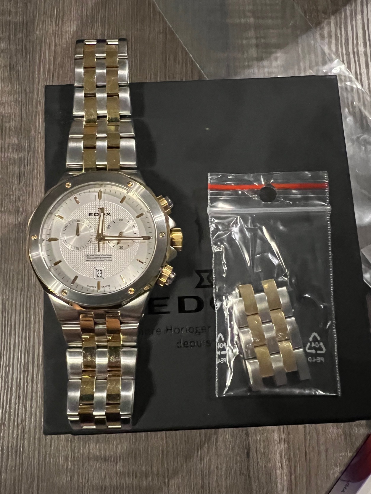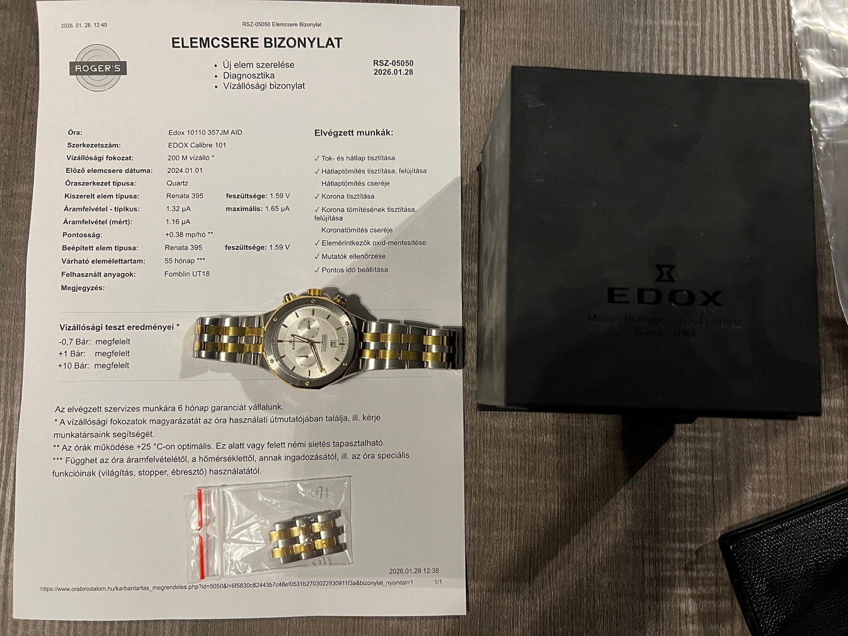 2021.12.15 vásárlás Edox 10110 357JM AID . Eladás oka csak annyi, hogy körülbelül 2 éve már nem hordok órát. Utolsó szervíz 2026.01.26.-án volt ezt az első fotóval igazolom. Van egy kisebb hibája ez az utolsó képen látszik. De ez gyakorlatilag nagyon közelről látszik.