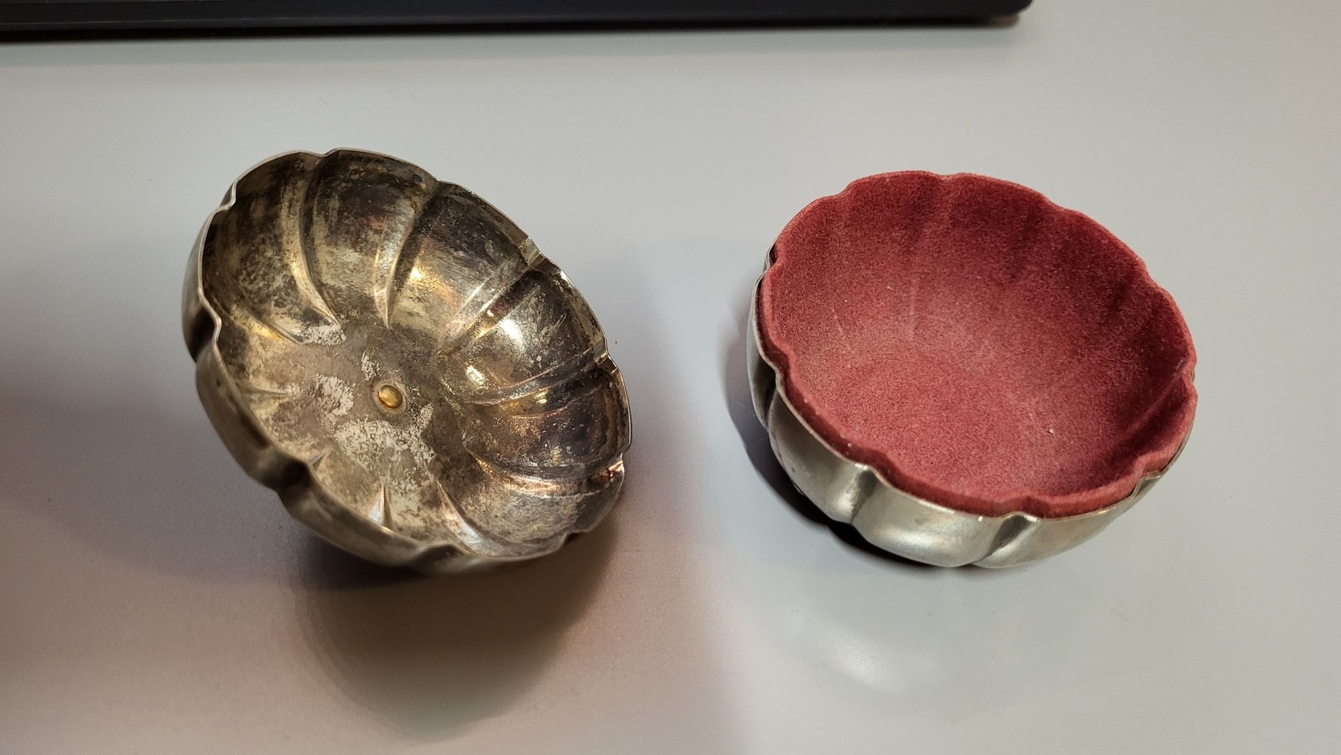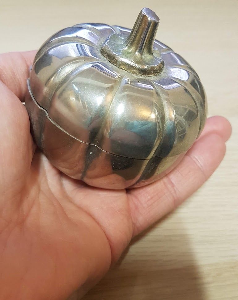 Fémből van, nehéz. Képen látható méretű, a teteje levehető, belül vörös anyaggal bélelt.
